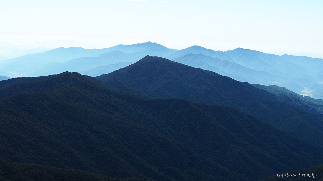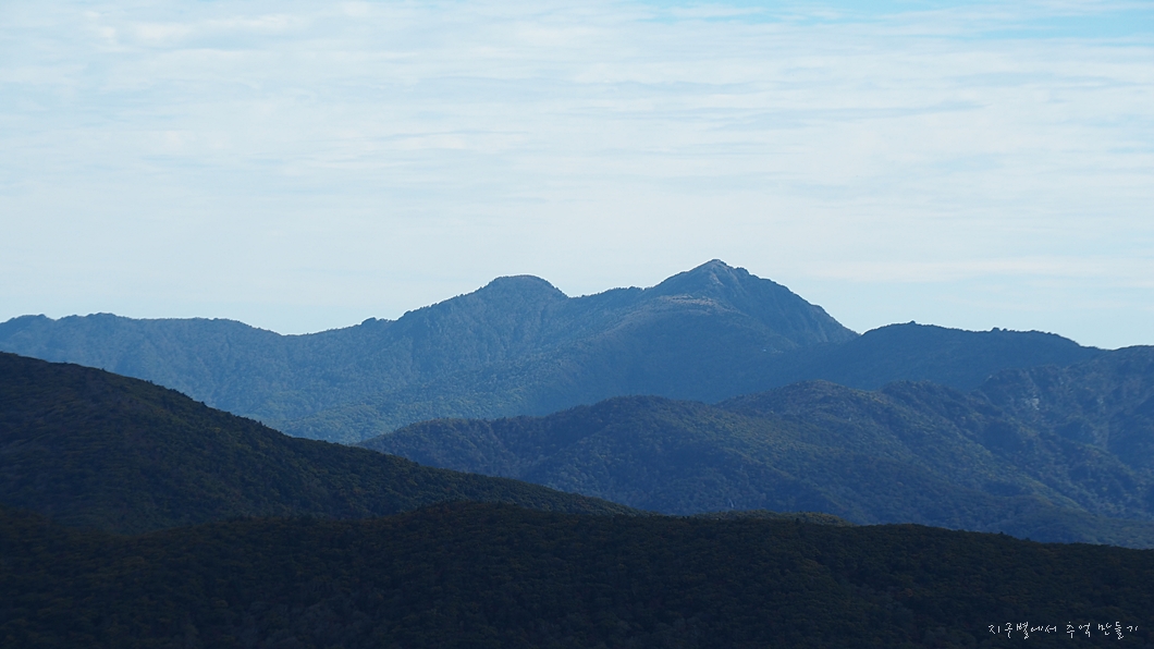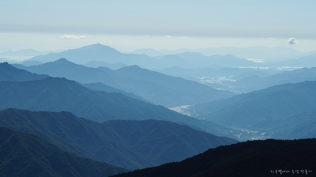 좌측으로는 촛대봉에서 흘러내리는 남부 능선, 중앙의 왕시루능선. 그 끝으로 광양의 백운산.