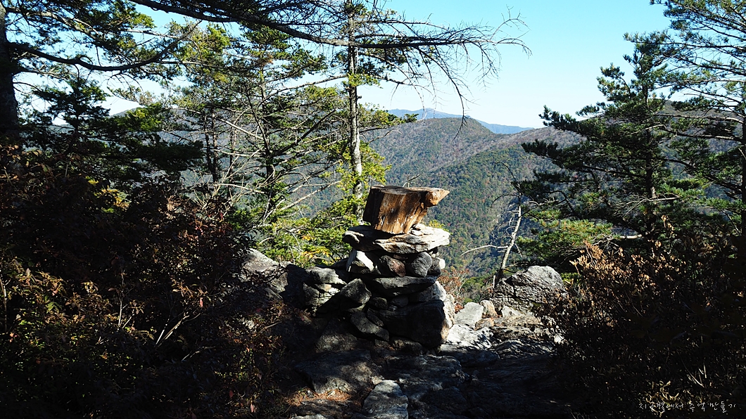 마당 끝에 돌축을 쌓고 그 위에 나무토막을 얹어 두었는데 앞쪽으로 토끼봉에서 천왕봉으로 이어지는 능선이 한눈에 들어 봅니다.
