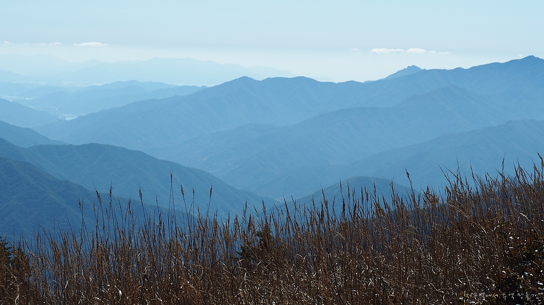 좌측으로 곧 가야 할 짝궁뎅이 반야봉과 그 뒤 천왕봉. 중앙으로는 왕시리능선이 이어지고 멀리 광양 백운산이 솟아 보입니다. 우측으로 섬진강과 구례읍이 내려다 보이고 계곡 쪽으로 화엄사가 살짝 조망됩니다.