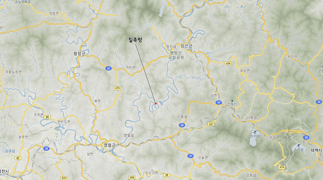 칠족령은 정선이 자랑하는 백운산 자락에 위치하고 있는데 정선 제장마을에서 평창 문희마을로 넘어오는 고갯길 같은 만댕이입니다.