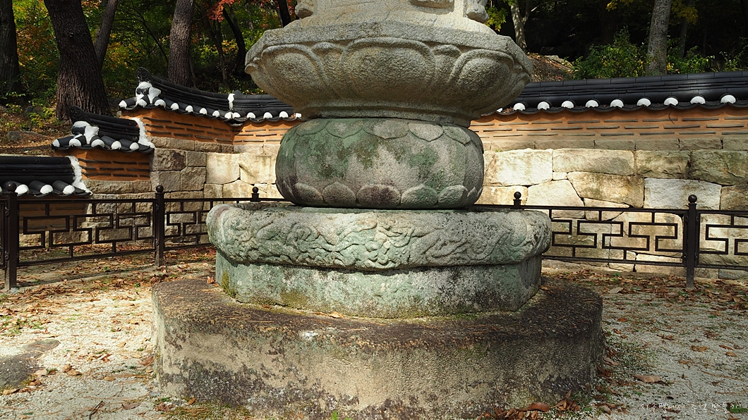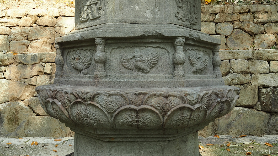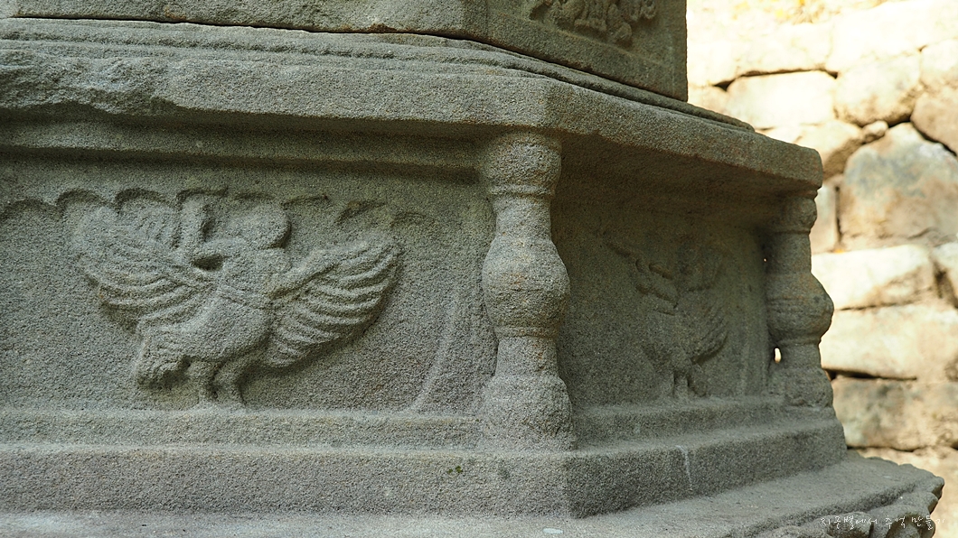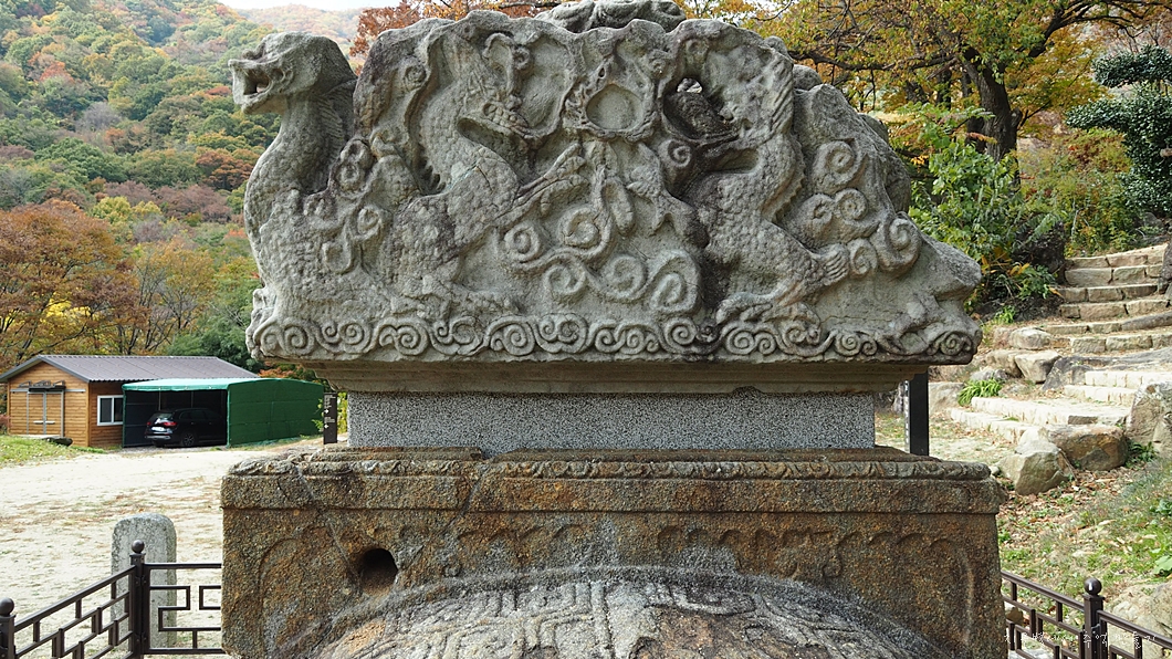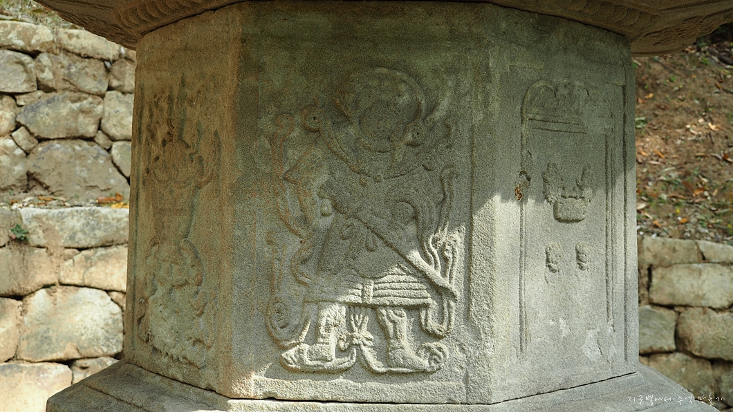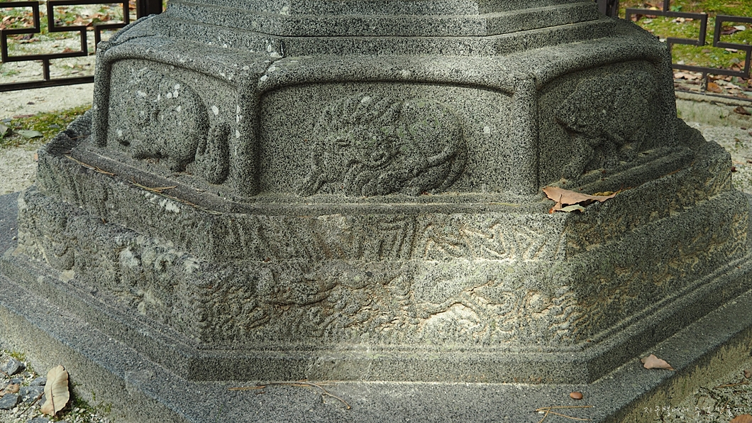 맨 아래에는 구름과 용을 장식 조각하였고 그 위의 중대석에는 각각 모양이 다른 사자를 새겨 놓았습니다.