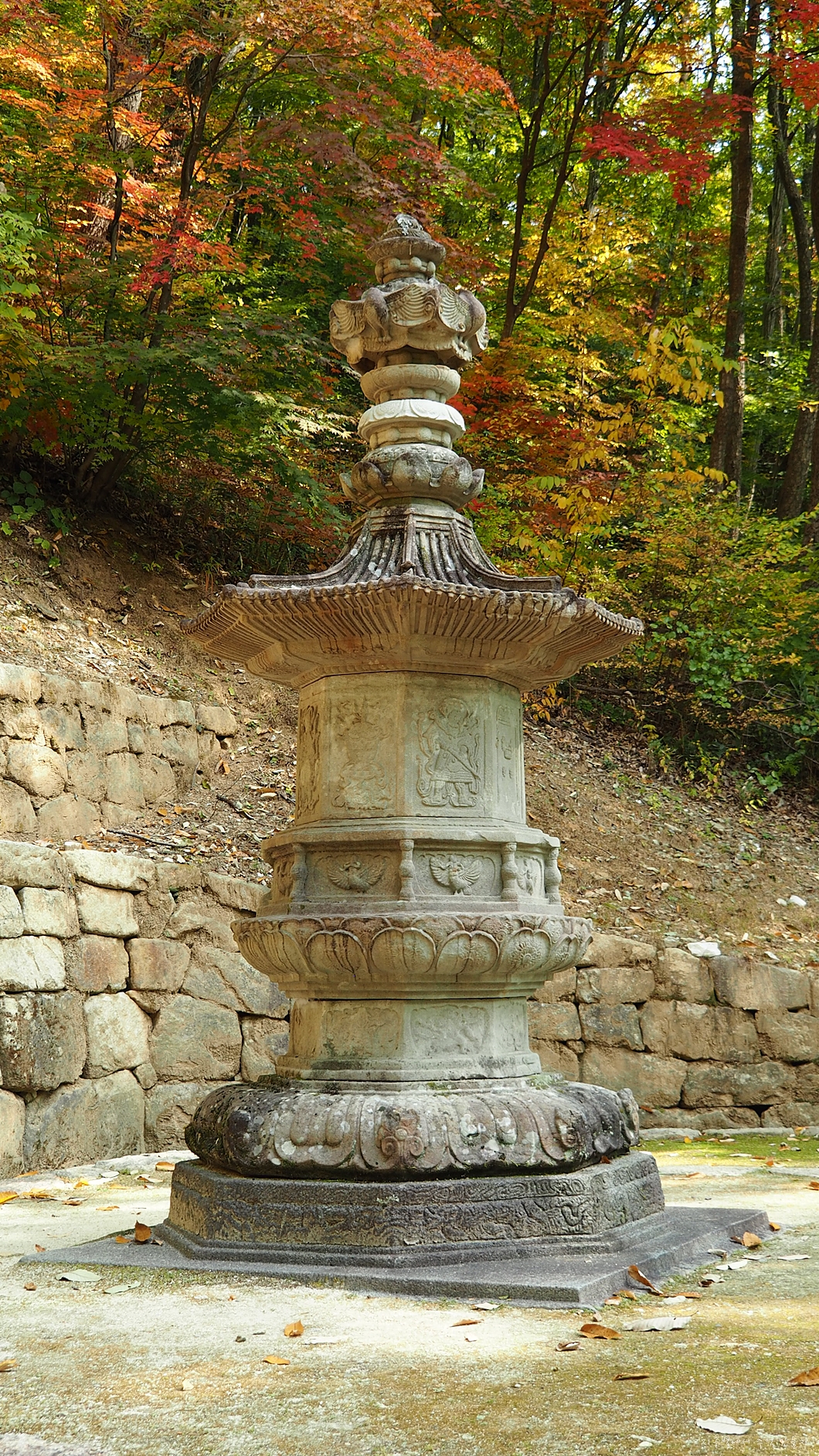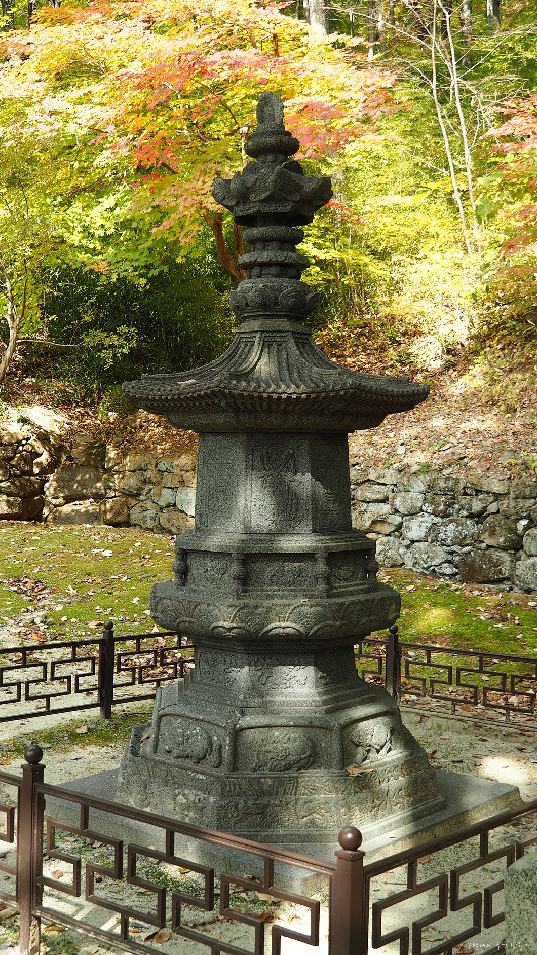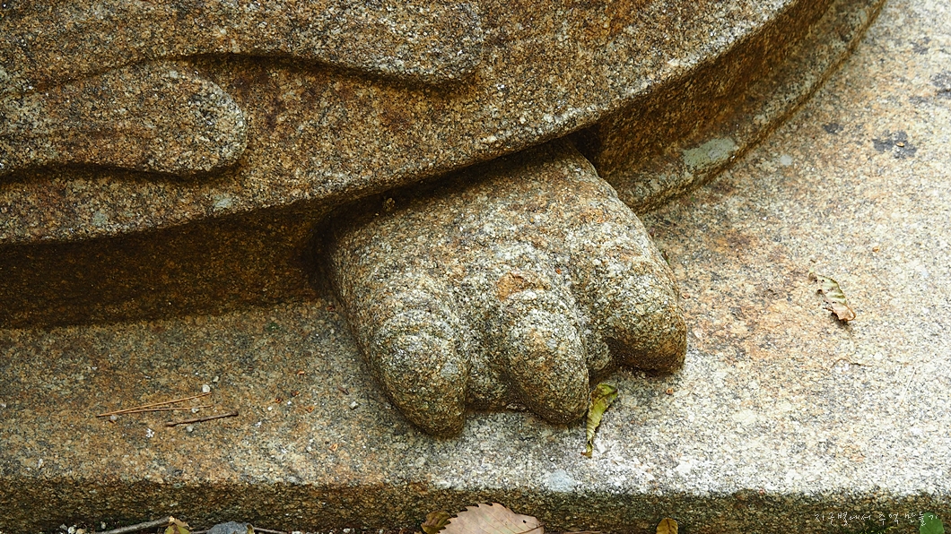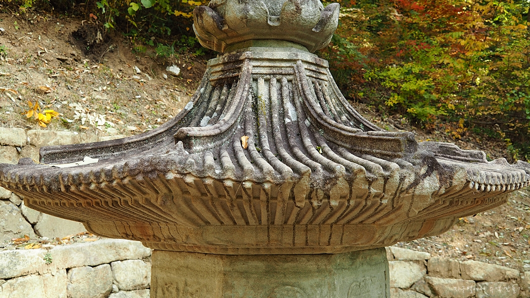 맨 아래에는 구름과 용을 장식 조각하였고 그 위의 중대석에는 각각 모양이 다른 사자를 새겨 놓았습니다.