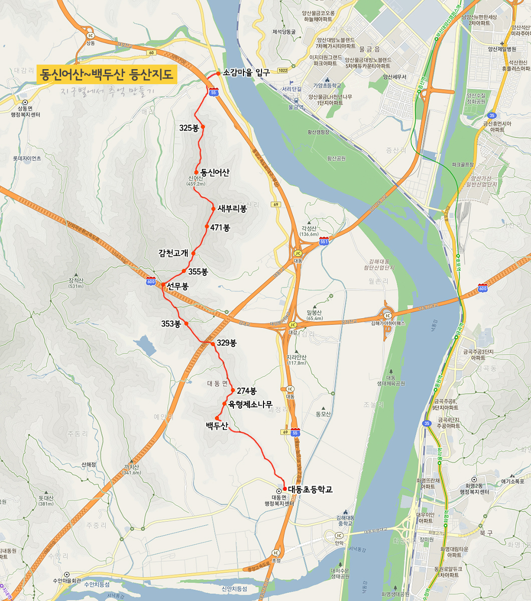 산행 코스 : 소감마을 입구 - 동신어산 - 새부리봉 - 감천고개 - 선무봉 - 백두산 - 대동초교... 택시 타고 소감마을 입구로