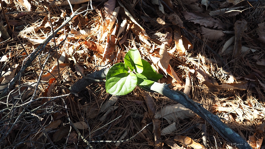 모든 이파리가 갈색으로 변해 대지 위에서 소멸되고 있는데 초록빛을 뛰우고 있는 넝쿨 잎 하나가 유난히 돋보입니다.