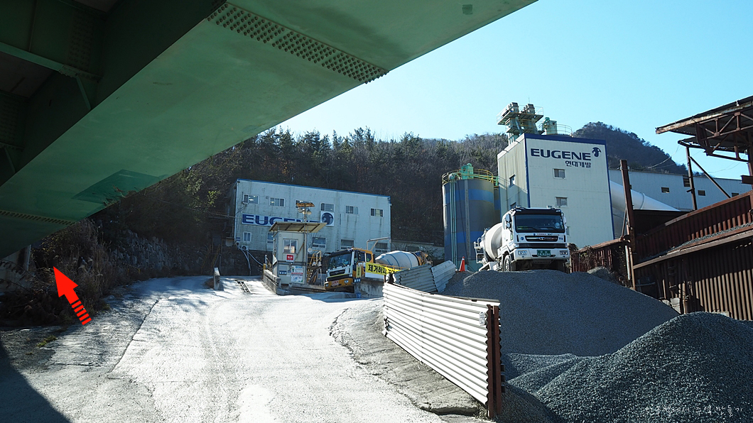현대개발 레미콘 공장이 나오고 위 사진의 화살표 방향에 안내판과 들머리 계단이 있습니다.