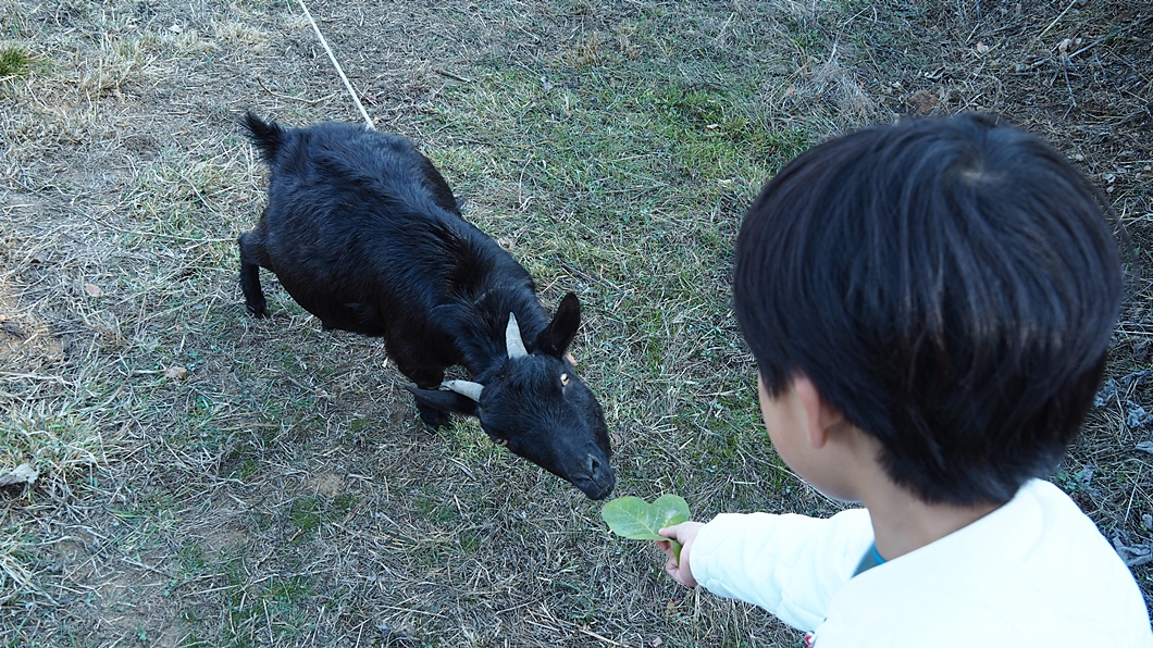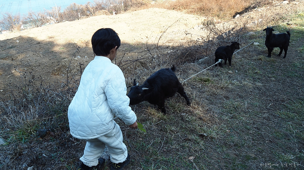 산기슭에서 칡잎을 몇 개 따서 염소와 친해지기 연습도 하고..