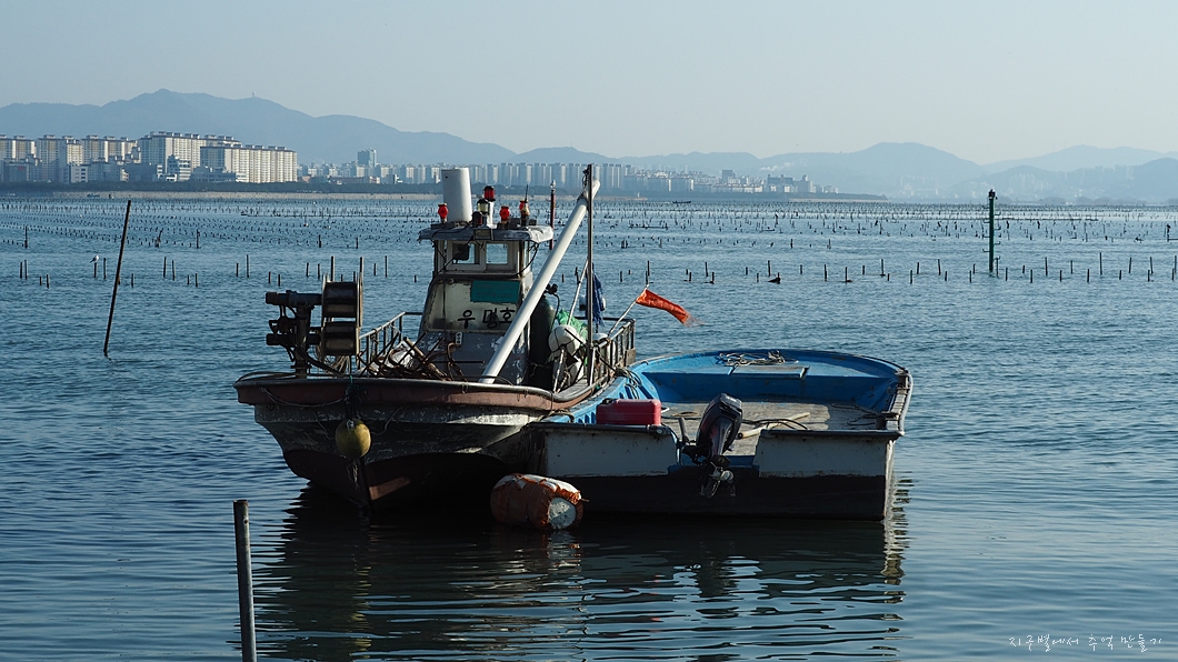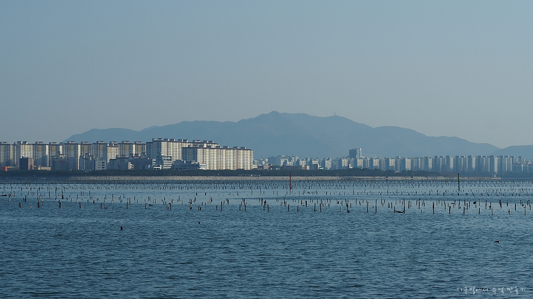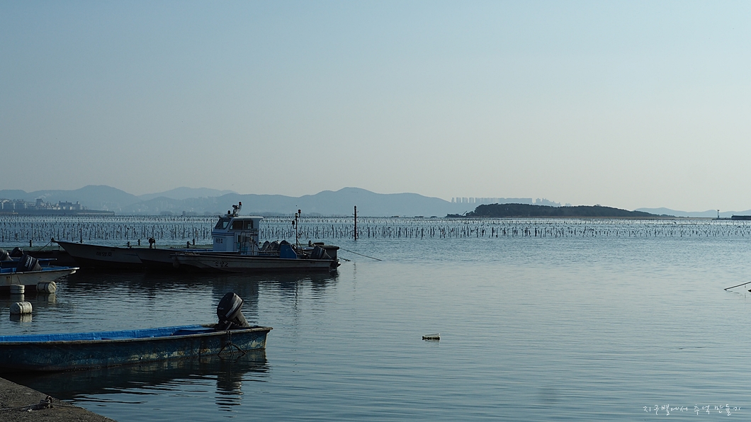 바다에 보이는 나무 기둥들은 모두 굴 종패를 키우는 장치들