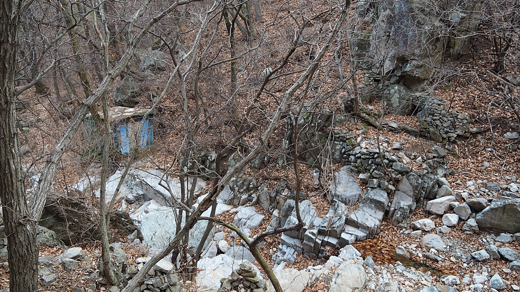 맞은편에는 작은 움막과 함께 사람이 만든 돌축이나 기도처 같은 흔적이 많이 보입니다.