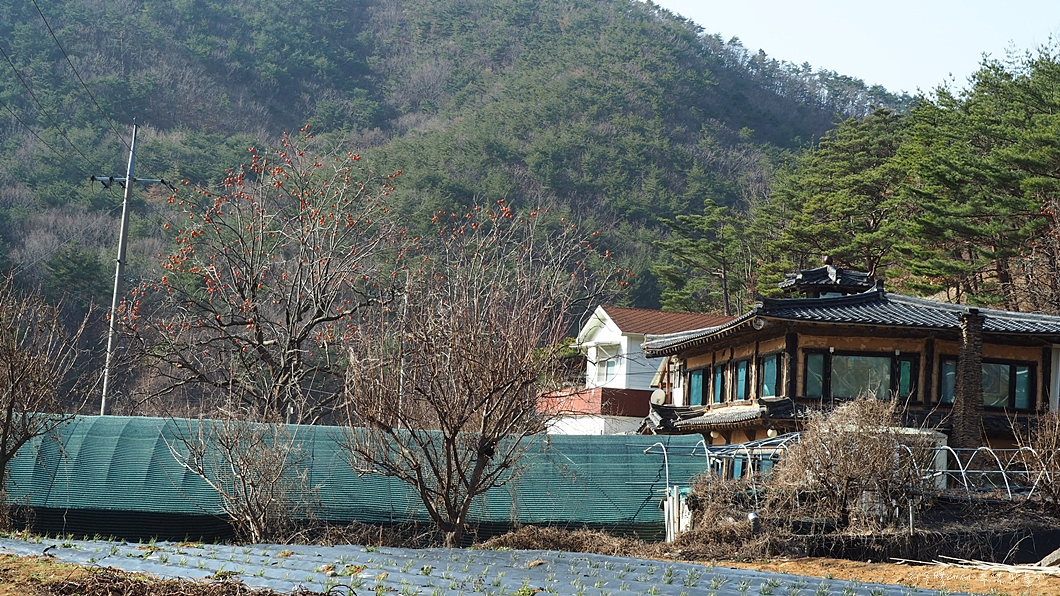 아직 붉은 감이 달려 있는 집 옆 도로를 따라 가는데 개가 마구 짖습니다.