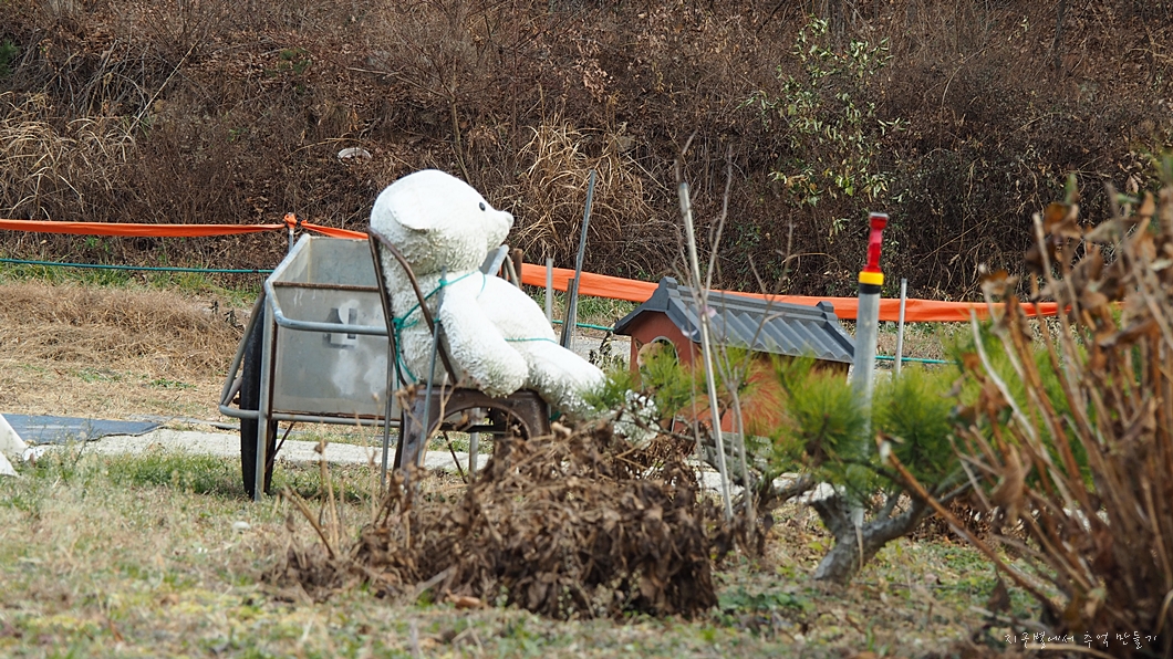 길 앞 어느 집 농장 안에 포승줄로 꽁꽁 묶여 있는 곰씨.