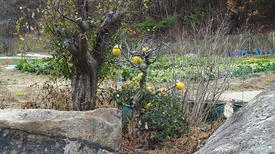 어느 집 앞의 분재 같은 모과나무를 구경합니다.