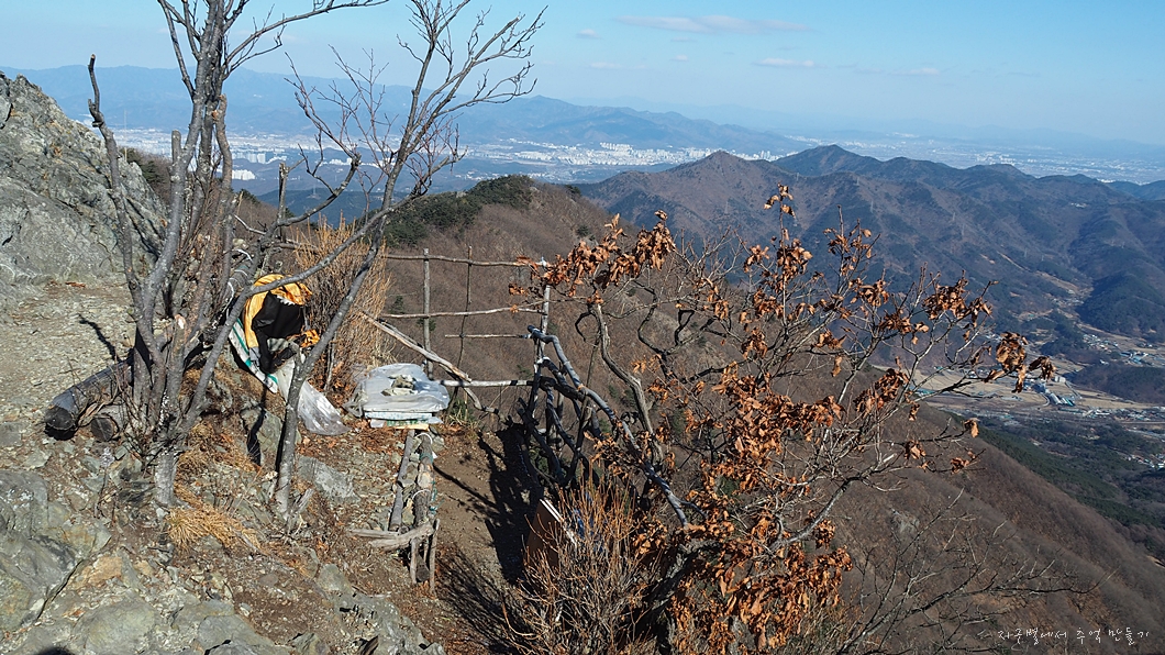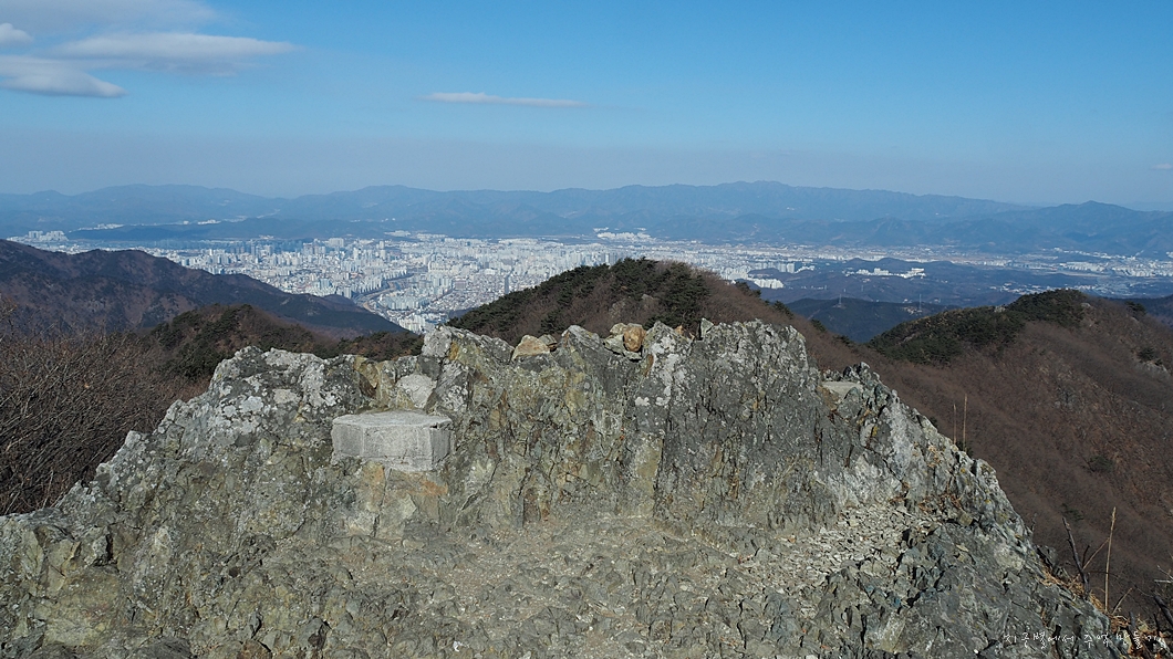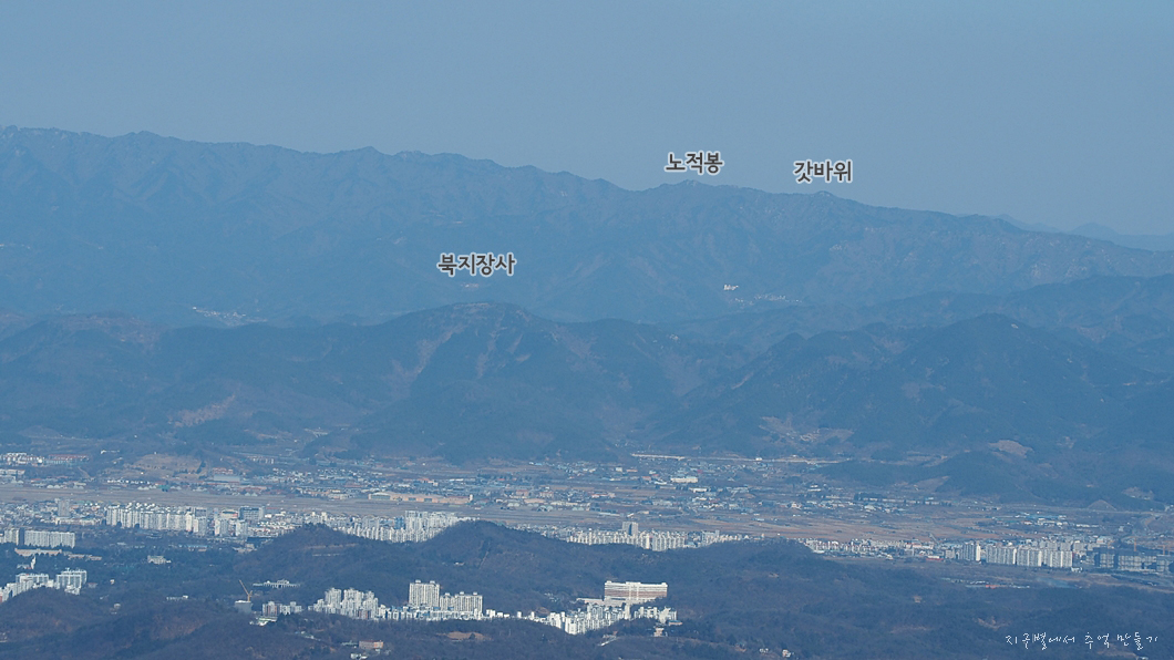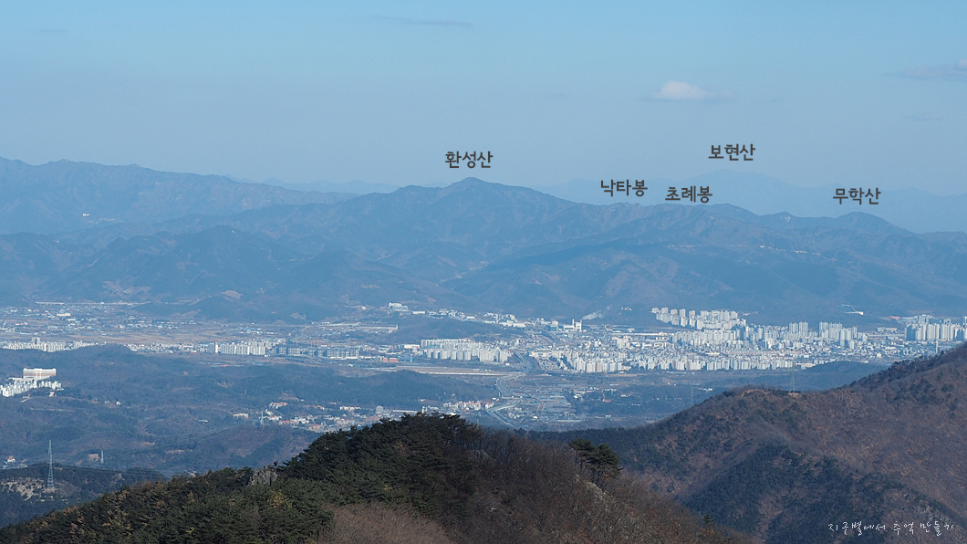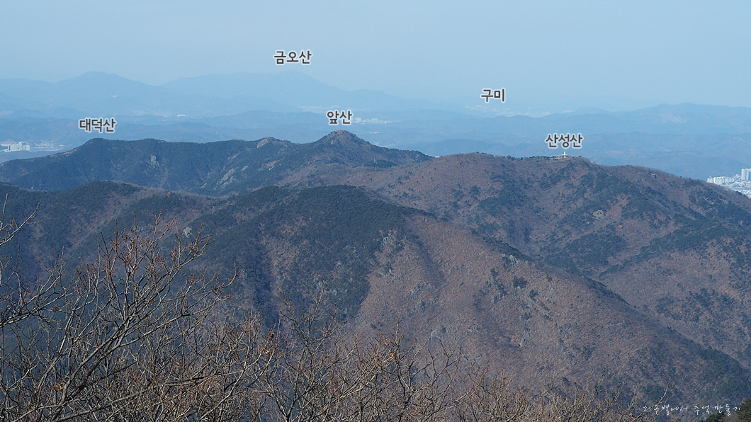이곳에서 보는 갓바위와 노적봉은 팔공산 주능이 남으로 틀어지는 구간이라 한눈에 탁 뜨이지는 않네요.