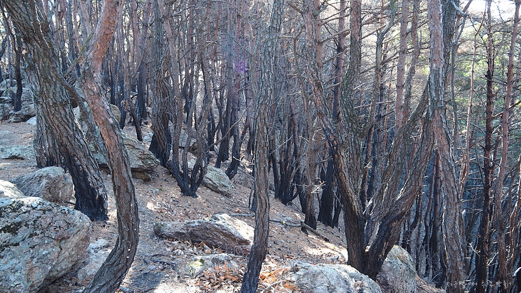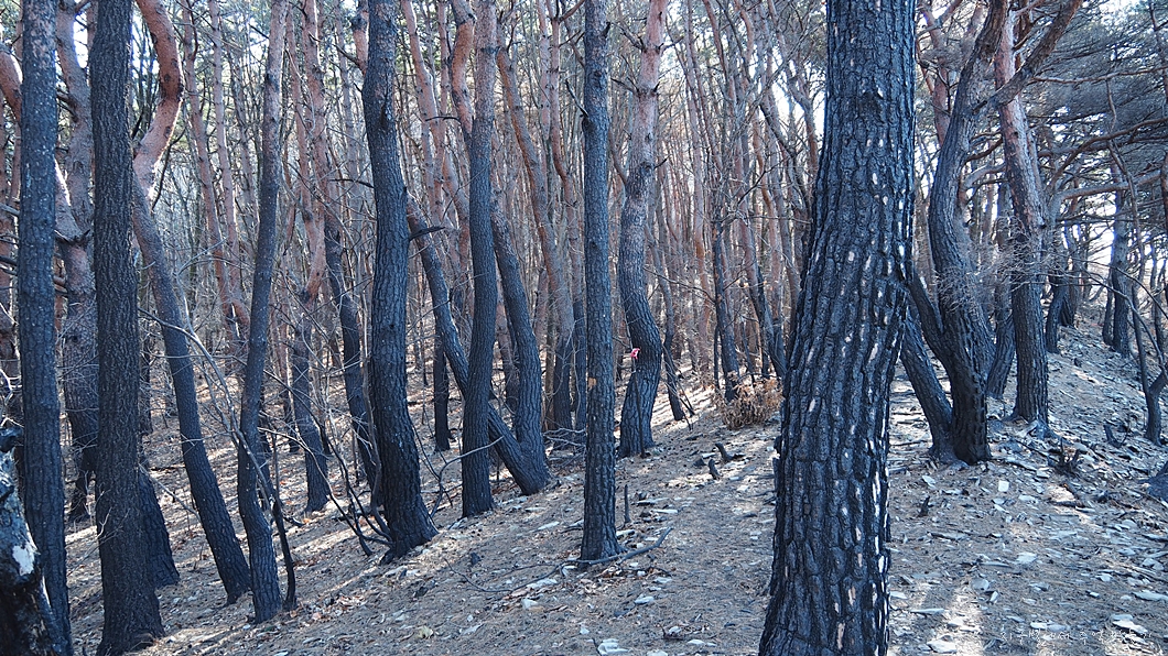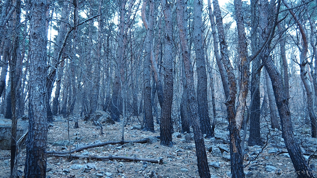 산에 오르는 내내 수십 년 된 소나무들이 모두 잿더미가 되어 있는 모습을 봐야 되는데 영 마음도 숯덩이가 되는 기분입니다.