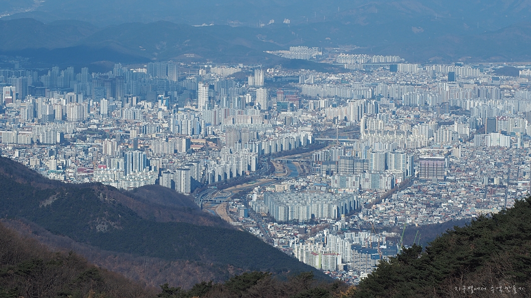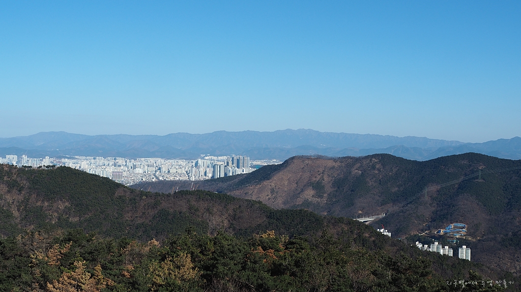 건너편 수성구 용지봉과 법이산 능선이 마주 보입니다.