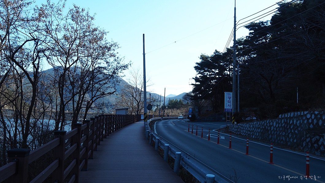 이전에는 인도가 없어 걸어 내려가면 차들과 마주쳐 많이 위험했는데 이제는 한쪽에 데크 둘레길을 만들어 두어 걷기 한결 수월합니다.