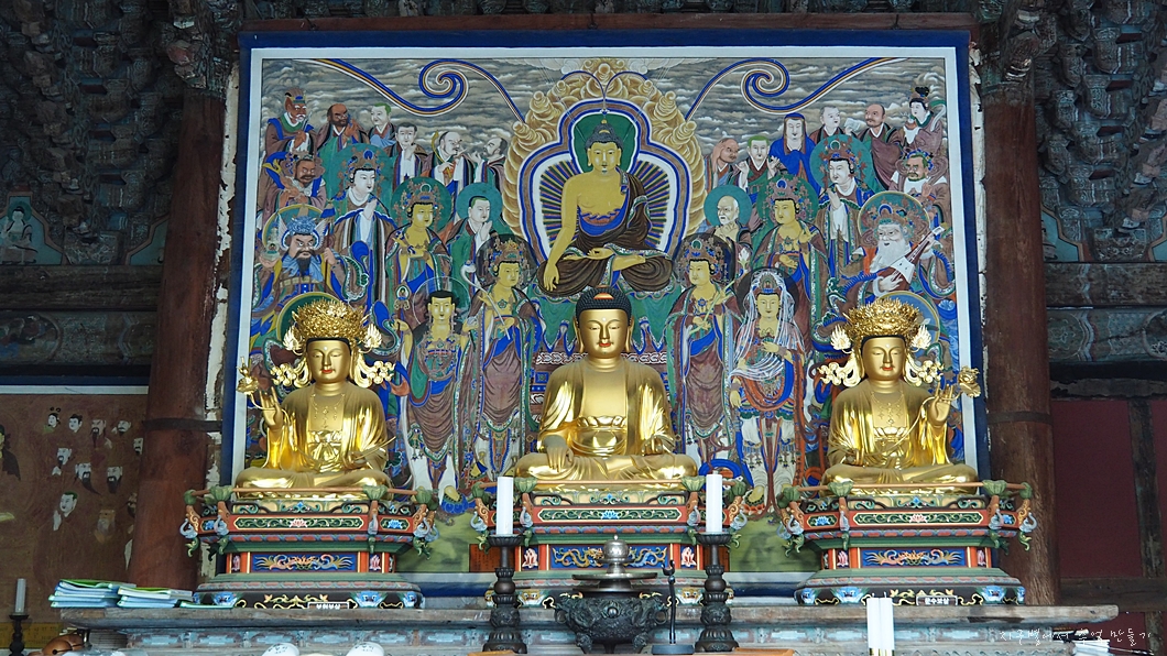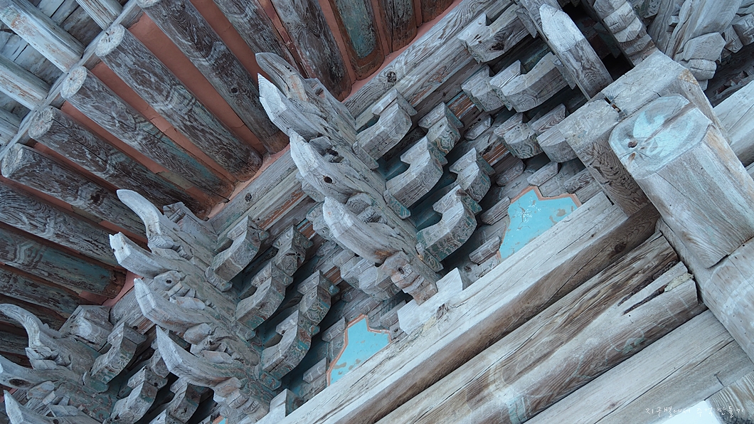 본전인 대웅보전은 얼핏 보면 단청을 하지 않는 듯 보이는데 본전 뒤편으로 돌아가서 위를 쳐다보면 아직도 채색이 남아 있는 단청 자국이 보인답니다.
