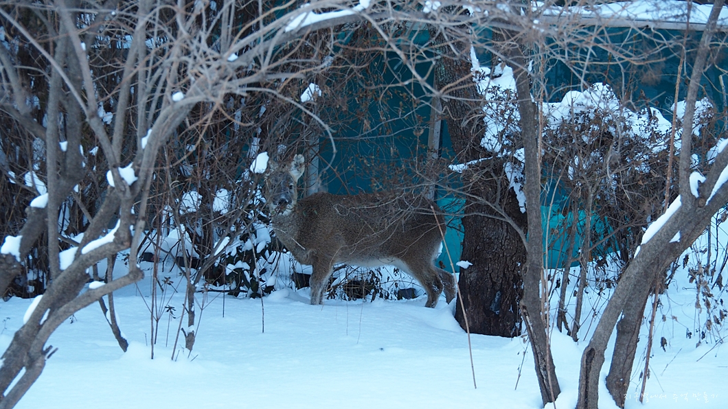 산에서 놀러 내려 온 고라니가 나를 멀꿈히 쳐다보고 있네요.