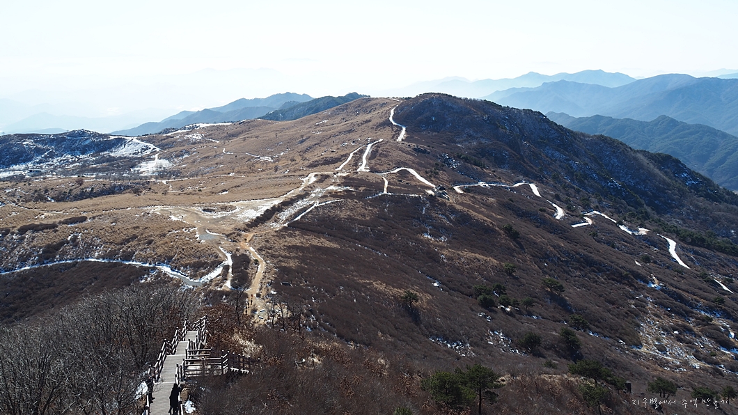 가운데가 올라온 능선길이고 우측으로 지리산이 보이네요.