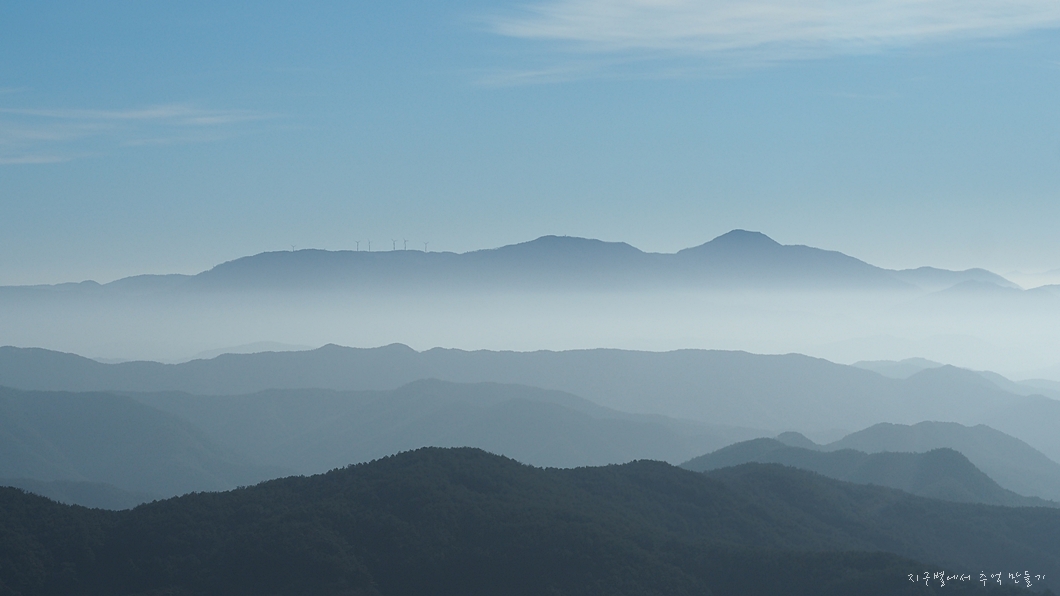 한우산 바람개비와 자굴산이 한 능선으로 조망됩니다.