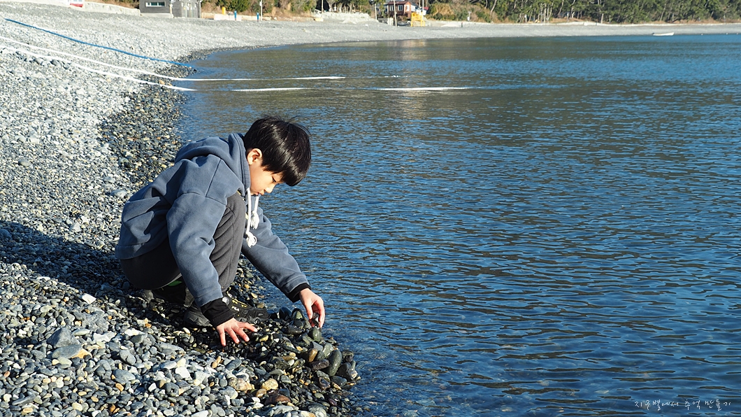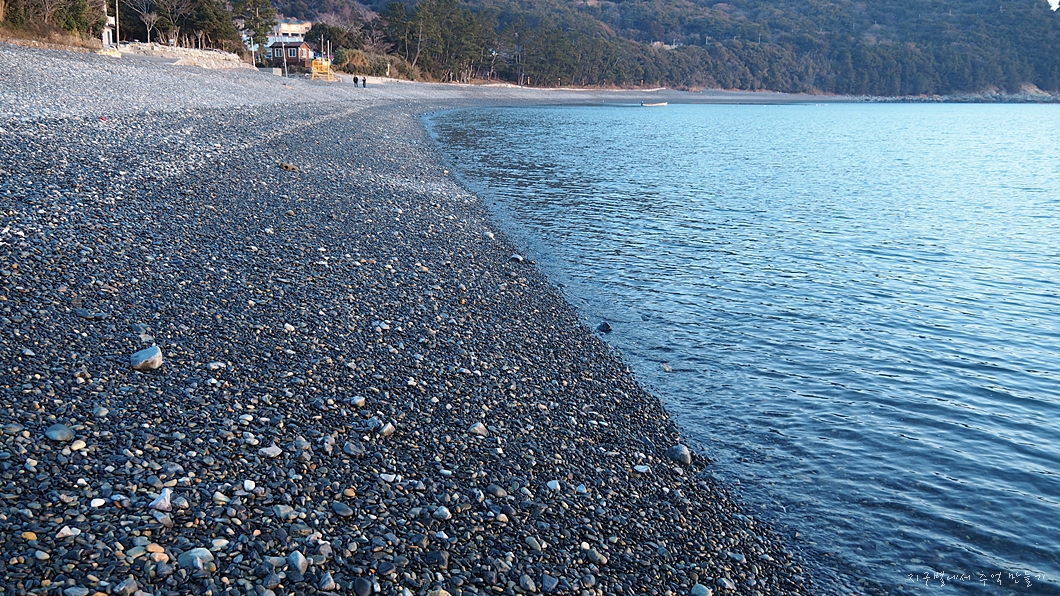 크지도 않은 바둑돌만 한 까만 갯돌로 된 해수욕장인데 우리나라 3대 몽돌 해수욕장입니다.