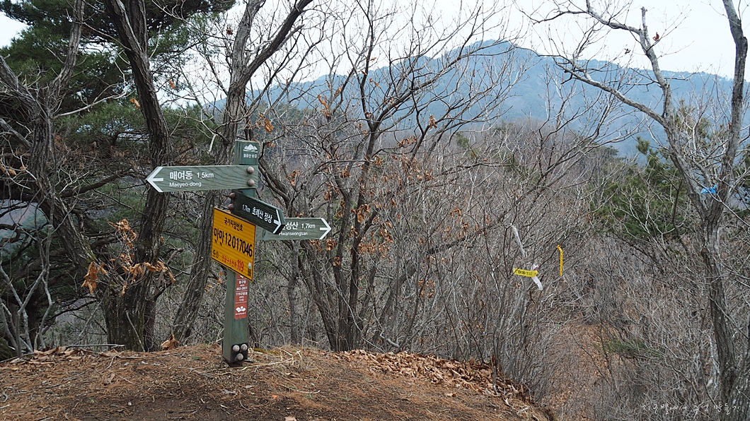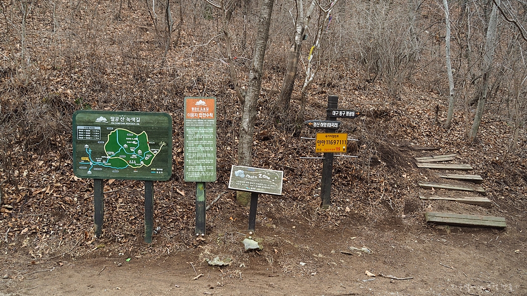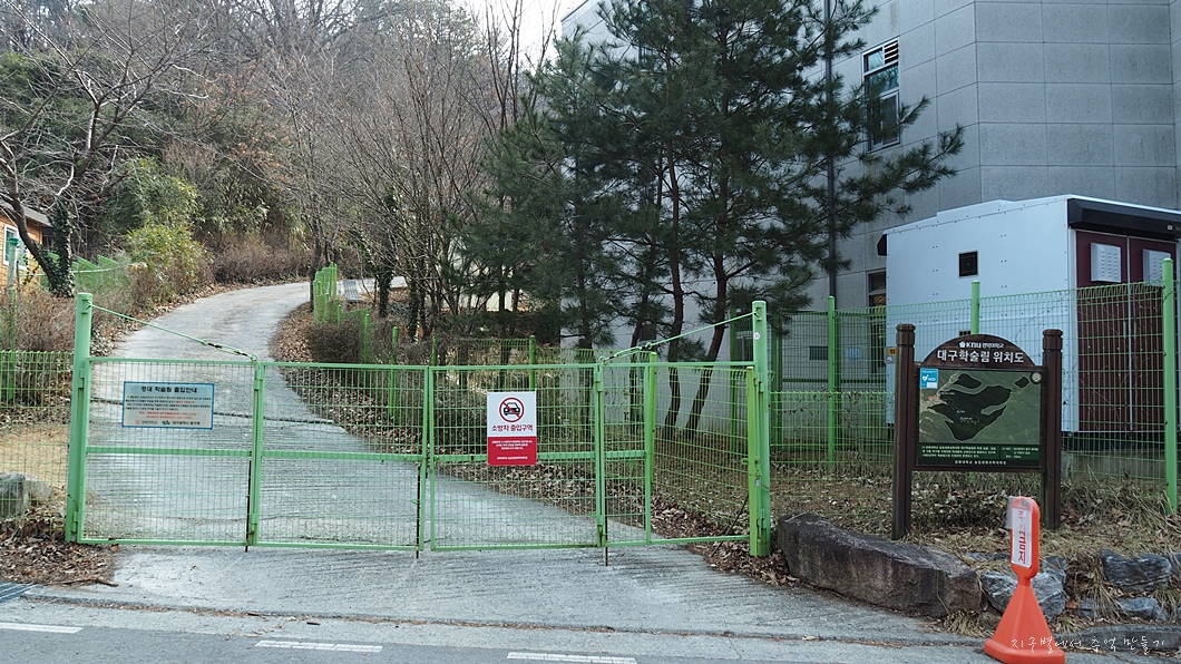 들머리는 매여동마을 주차장에서 산 쪽으로 포장도로를 따라 100여 m 올라가면 우측으로 경북대 학습림 건물이 있고 초록색 대문이 있는데 쪽문은 항상 열려 있습니다.