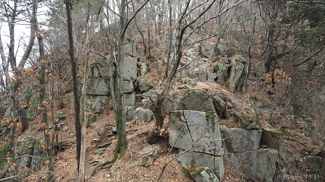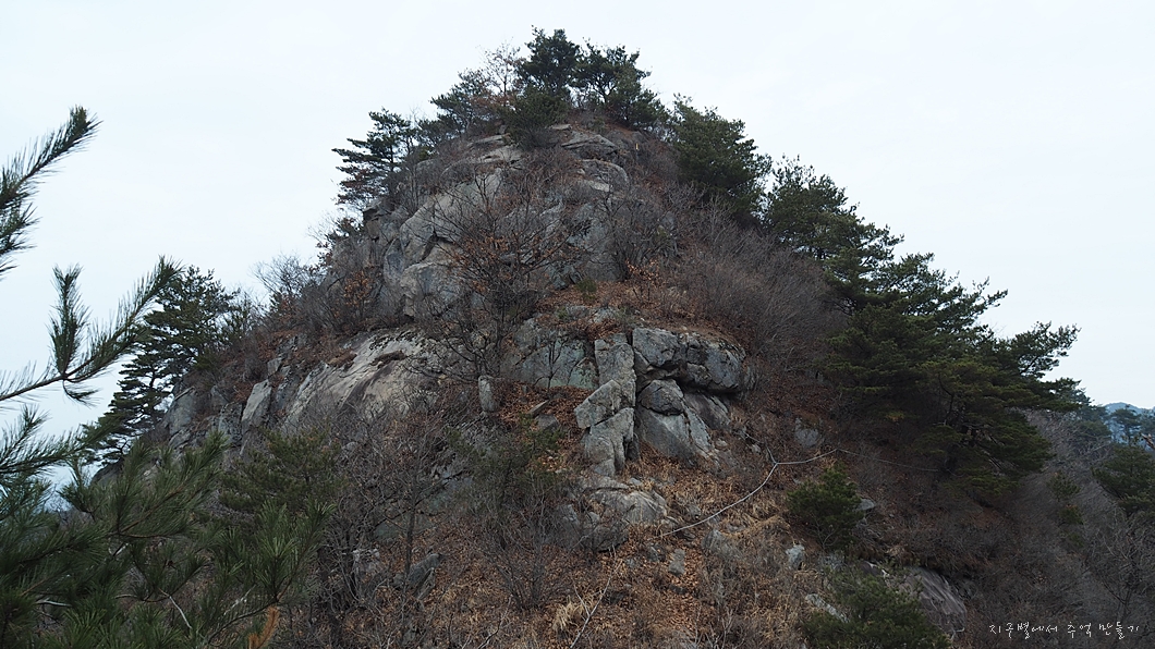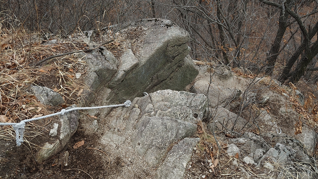 보이는 바위의 턱을 왼편으로 돌아서 지나가야 하는데 겨울에는 꽁꽁 얼어있고 눈이 있어 조심해야 하지유.