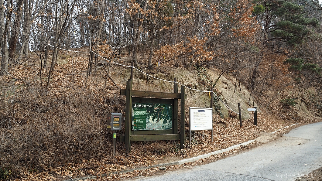 남의 집 들어가는 기분이라 찝찝하다면 이곳에서 다시 위로 50m 정도 더 오르면 초례봉산림욕장 입구가 나오는데 그곳으로 올라도 같은 코스가 됩니다.