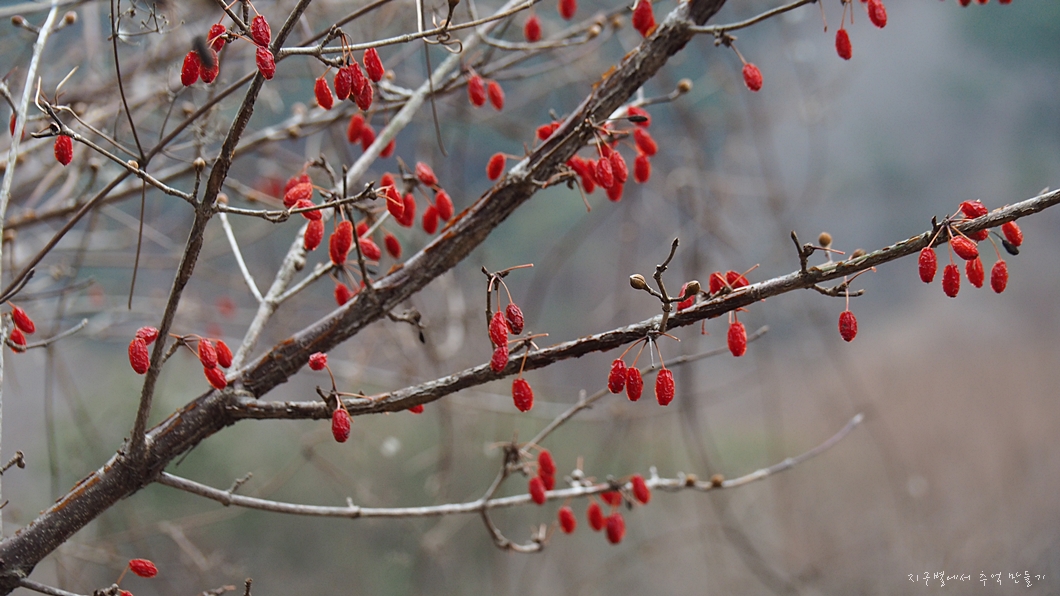 산수유가 꽃이 필 날도 얼마 남지 않았는데 아직도 열매를 달고 있네요.