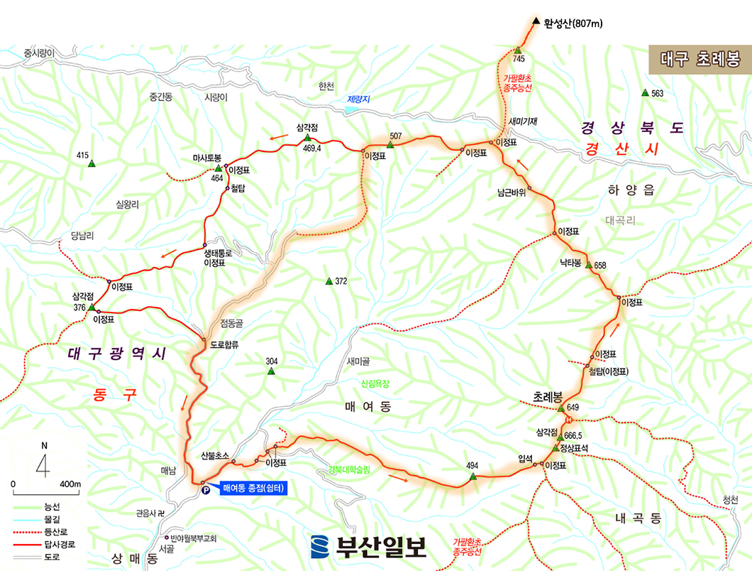 대구는 분지형태로 주변이 온통 산인데 북동쪽에 있는 환성산~초례봉 구간은 가팔환초 마지막 코스로서 조망이 탁월한 근교 산행지입니다.