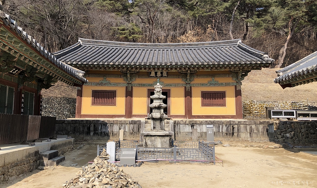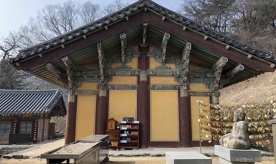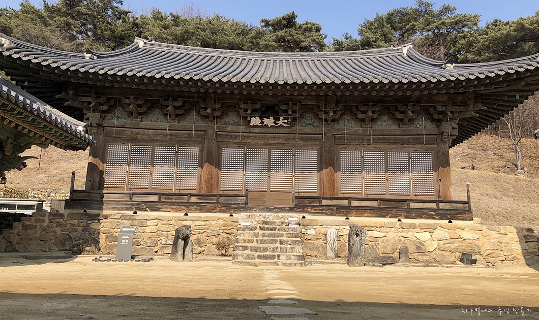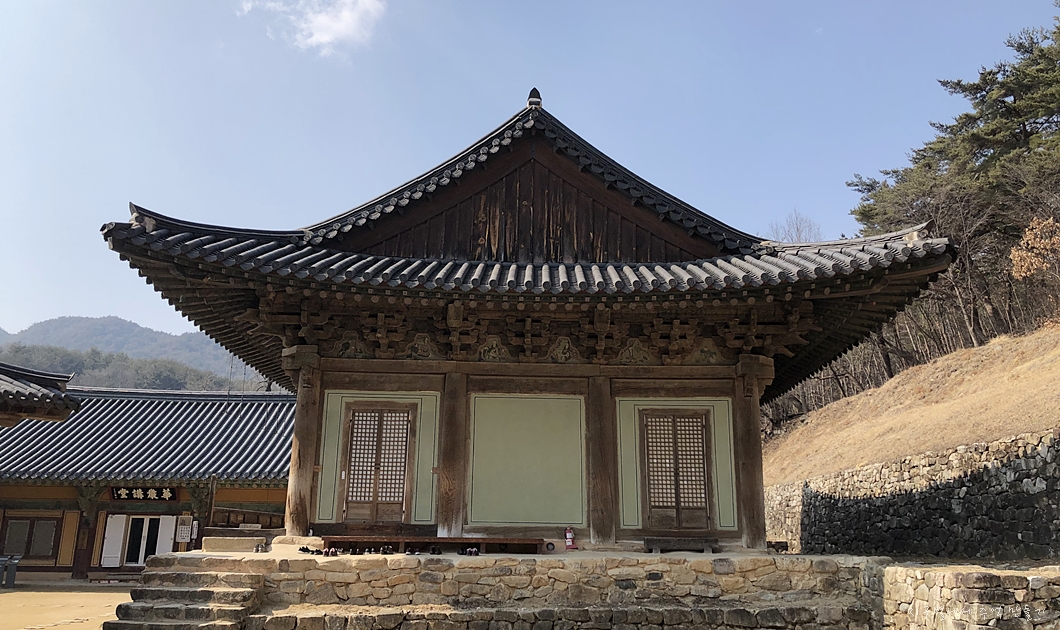 그리크지 않은 이 사찰에는 우리나라에서 가장 오래된 목조 건물, 13세기 고려시대 지은 극락전이 있고 조선시대 지은 대웅전도 있는데 둘 다 국보문화재입니다.