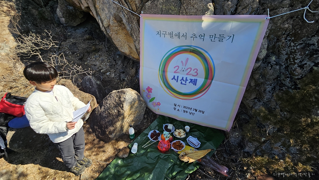 회장, 고문, 감사, 총무 겸, 산행대장인 두가와 부대장 직함에다 이날 집사 역할을 한 지율군이 같이 마음을 모아 시산제 지내고 고도 신라의 보물창고인 남산 자락을 둘러봤답니다.