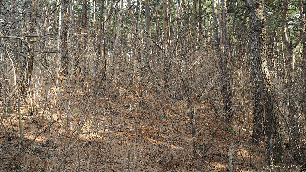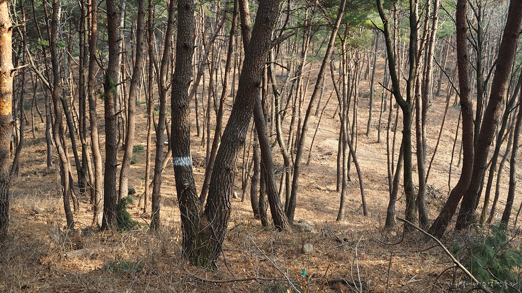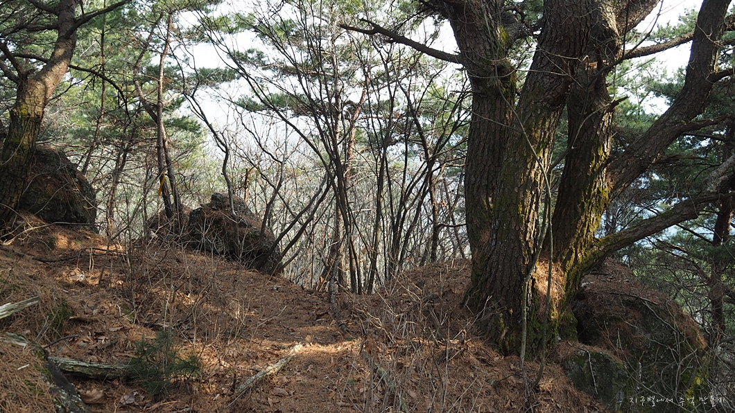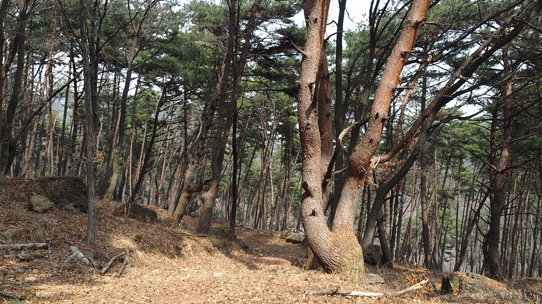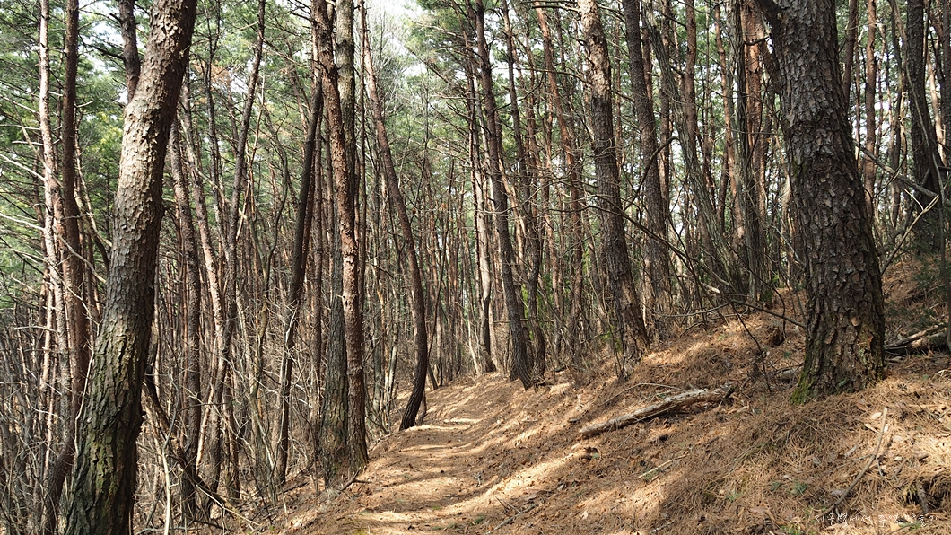 산봉우리 옆을 타고 도는 산길이라 오르내림이 거의 없는 소나무 숲길이구요.