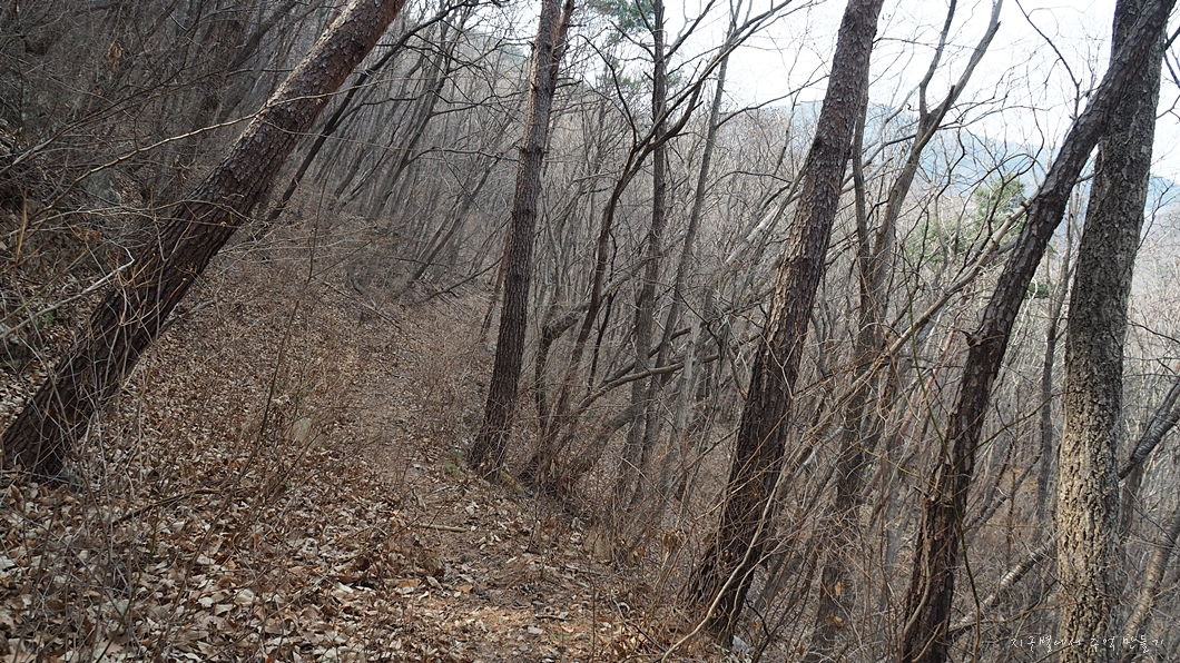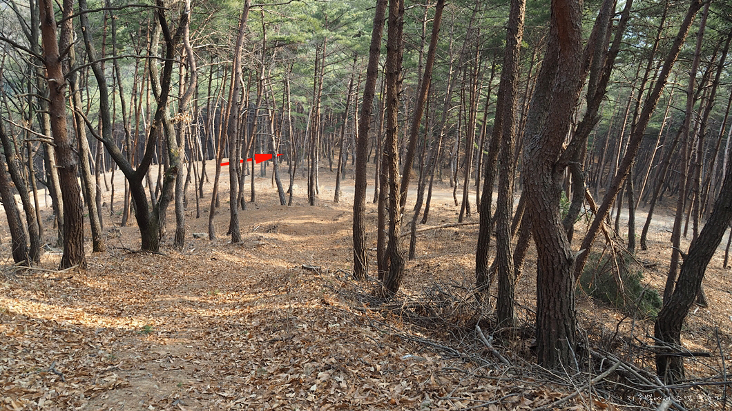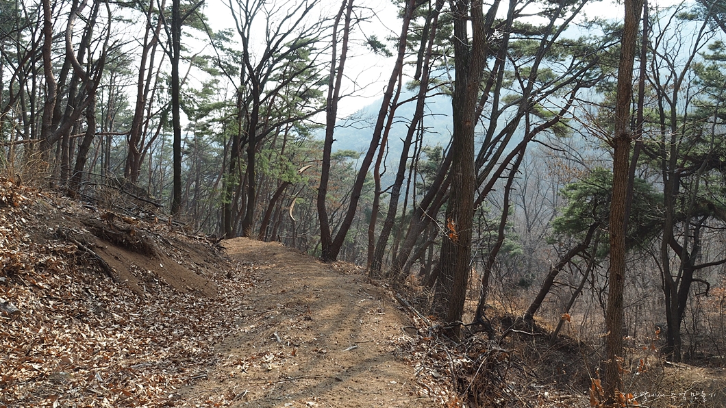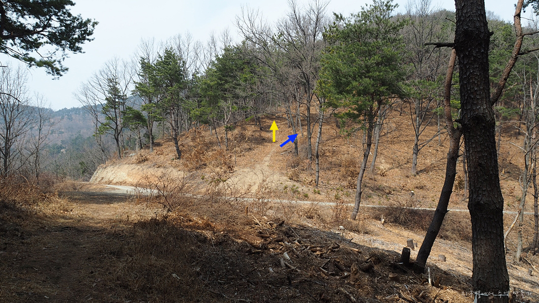 위 묘지에서 상단 좌측으로 나가면 임도 형식의 산길을 만나게 되고 조금 더 따라가면 능선에서 올라오는 등산로와 만나게 됩니다.