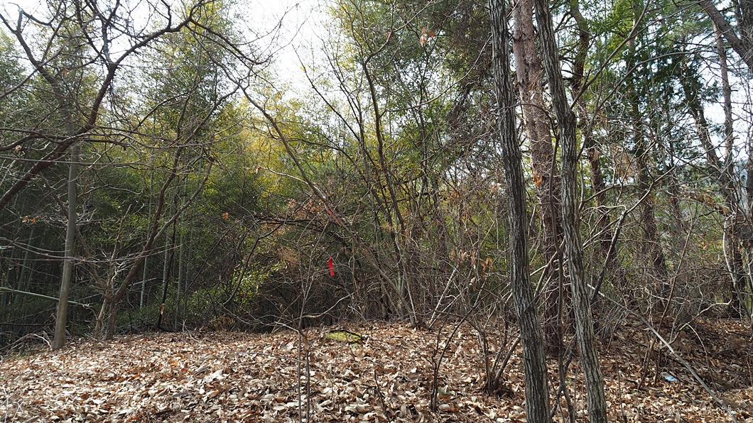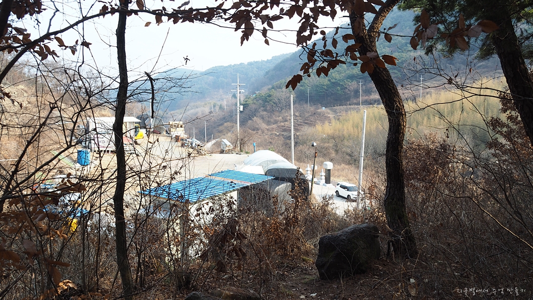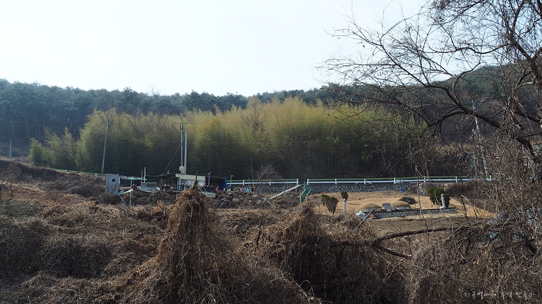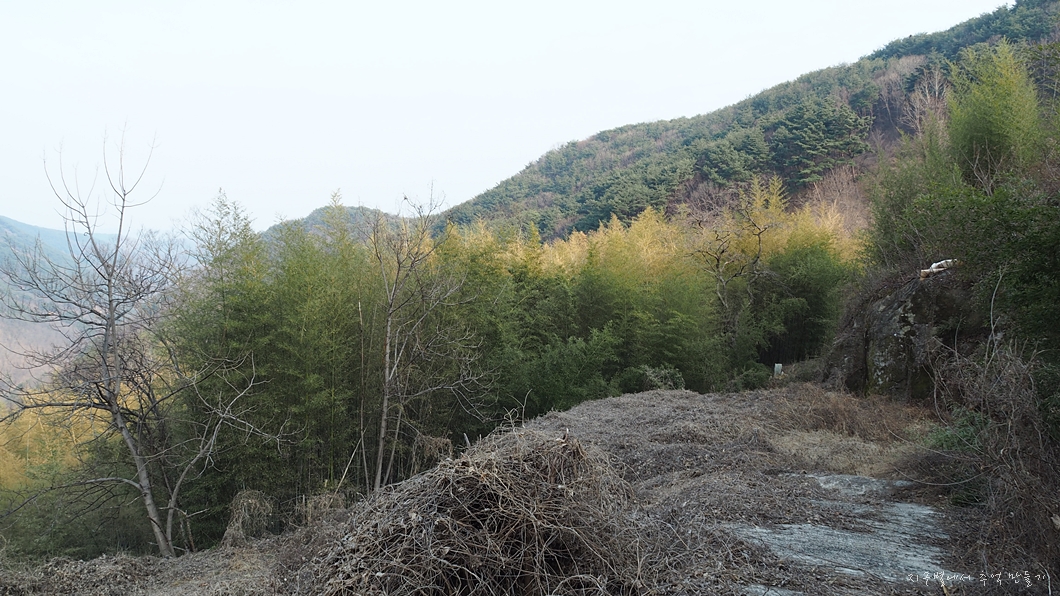 이 시설물 좌측으로 돌아서 가는 대밭길이 있는데 묵은 대나무들이 쓰러져서 길은 뚜렷하지 않습니다.