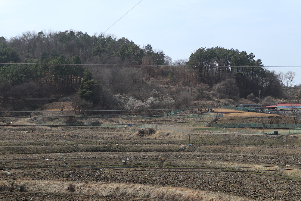 엊그제만 해도 무덤덤하던 건너편 야산에 매화가 피었군요.