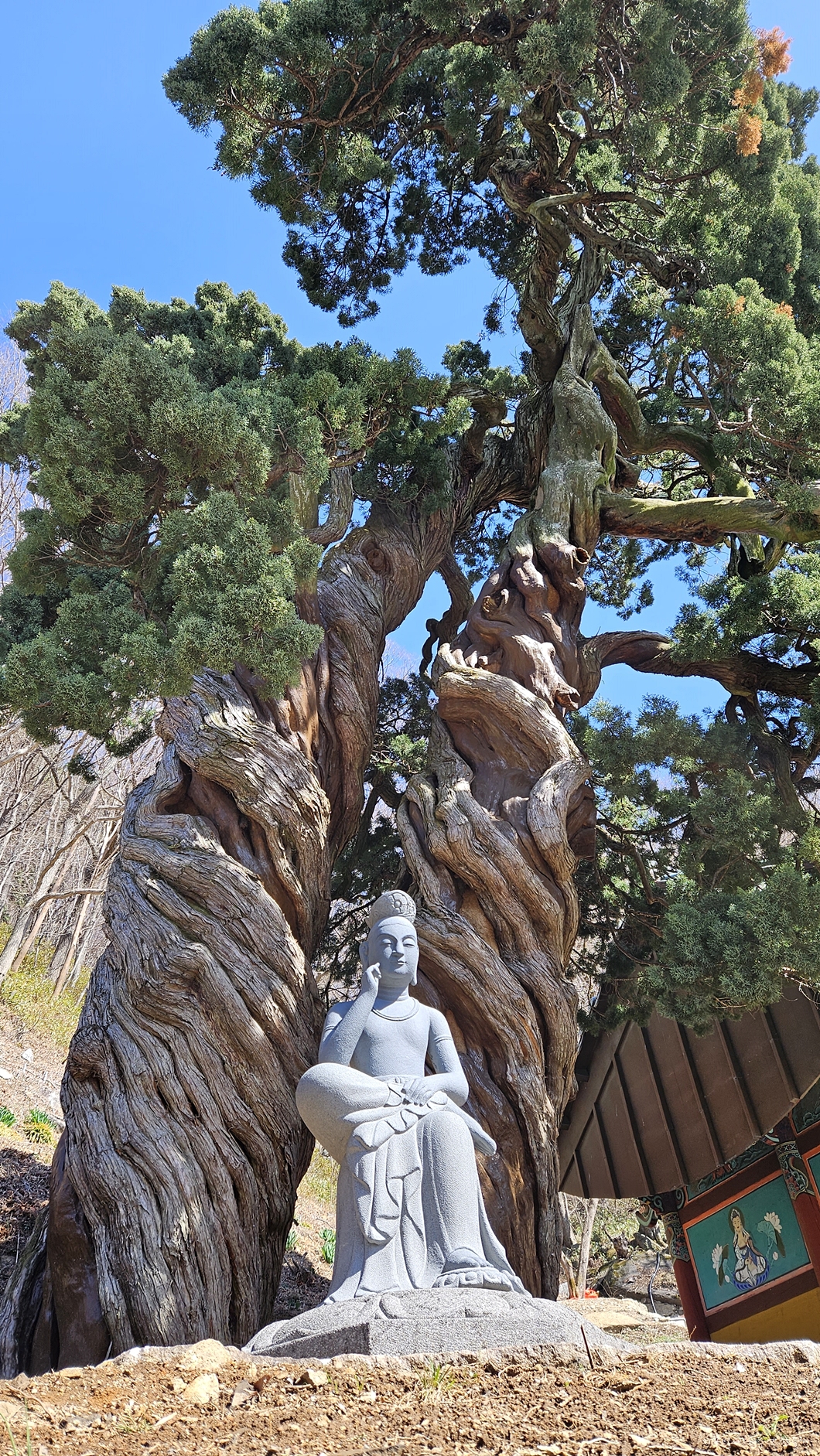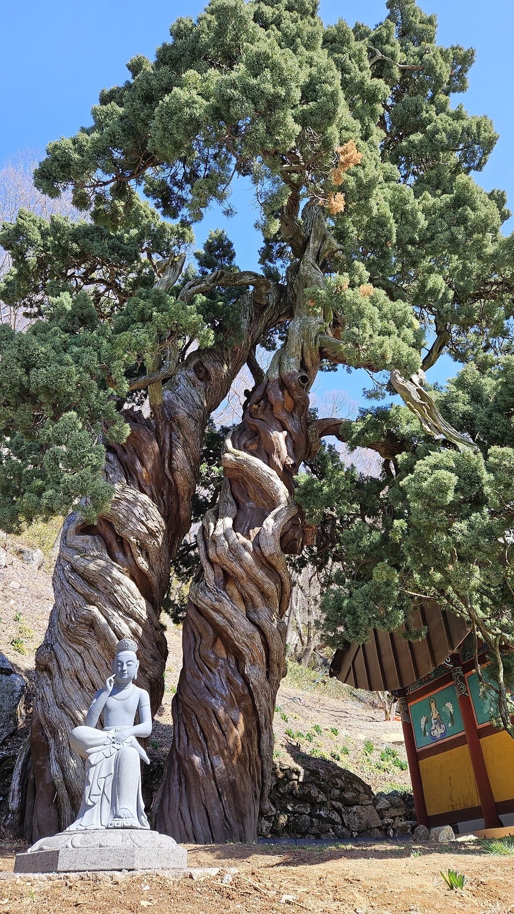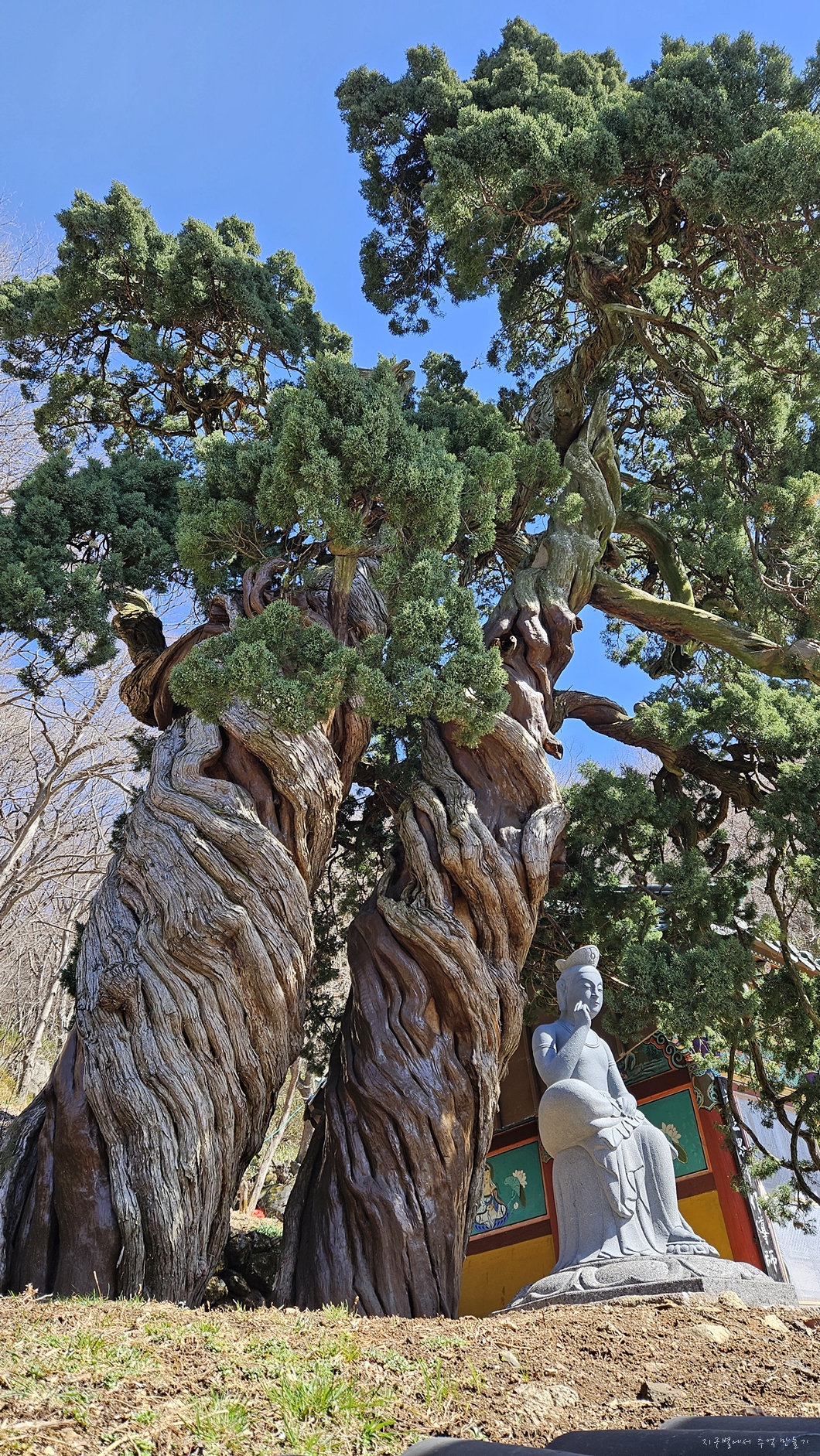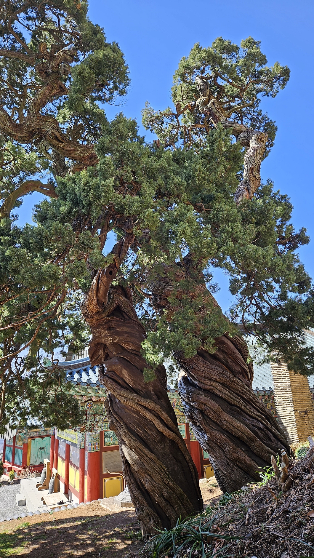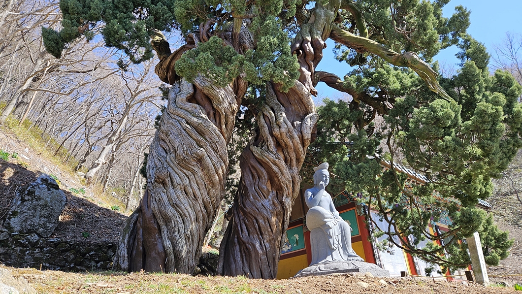 수령 800년인 향나무 두 그루가 용틀림으로 기대어 자라고 있답니다.