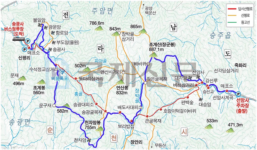 산행 코스 : 선암사주차장 - 선암사 - 장군봉(정상) - 배바위 - 보리밥집 - 천자암 - 송광사 - 불일암 - 송광사주차장