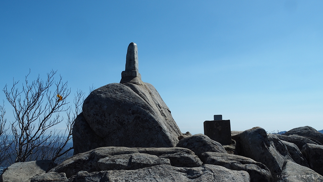 정상석 앞쪽 비스듬한 바위에 태극기를 박아둔 바위가 있습니다.