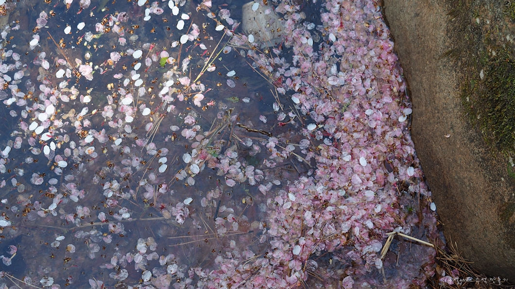 꽃비 내린 계곡에서 스틱 바스켓 씻고 다시 천천히 걸어 내려갑니다.