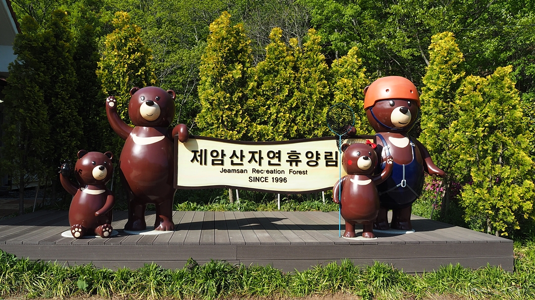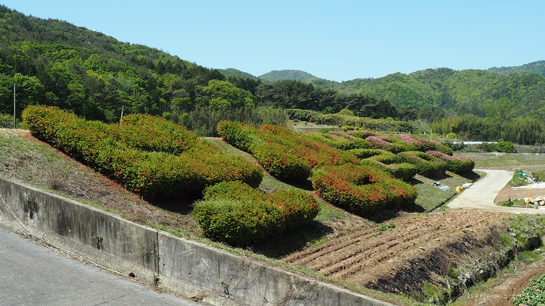 용추 입구 주차장 옆에 철쭉으로 보성 일림산이란 글자가 진분홍 꽃으로 새겨져야 하는데 꽃이 바람에 많이 떨어져 녹색 글씨가 되었습니다.