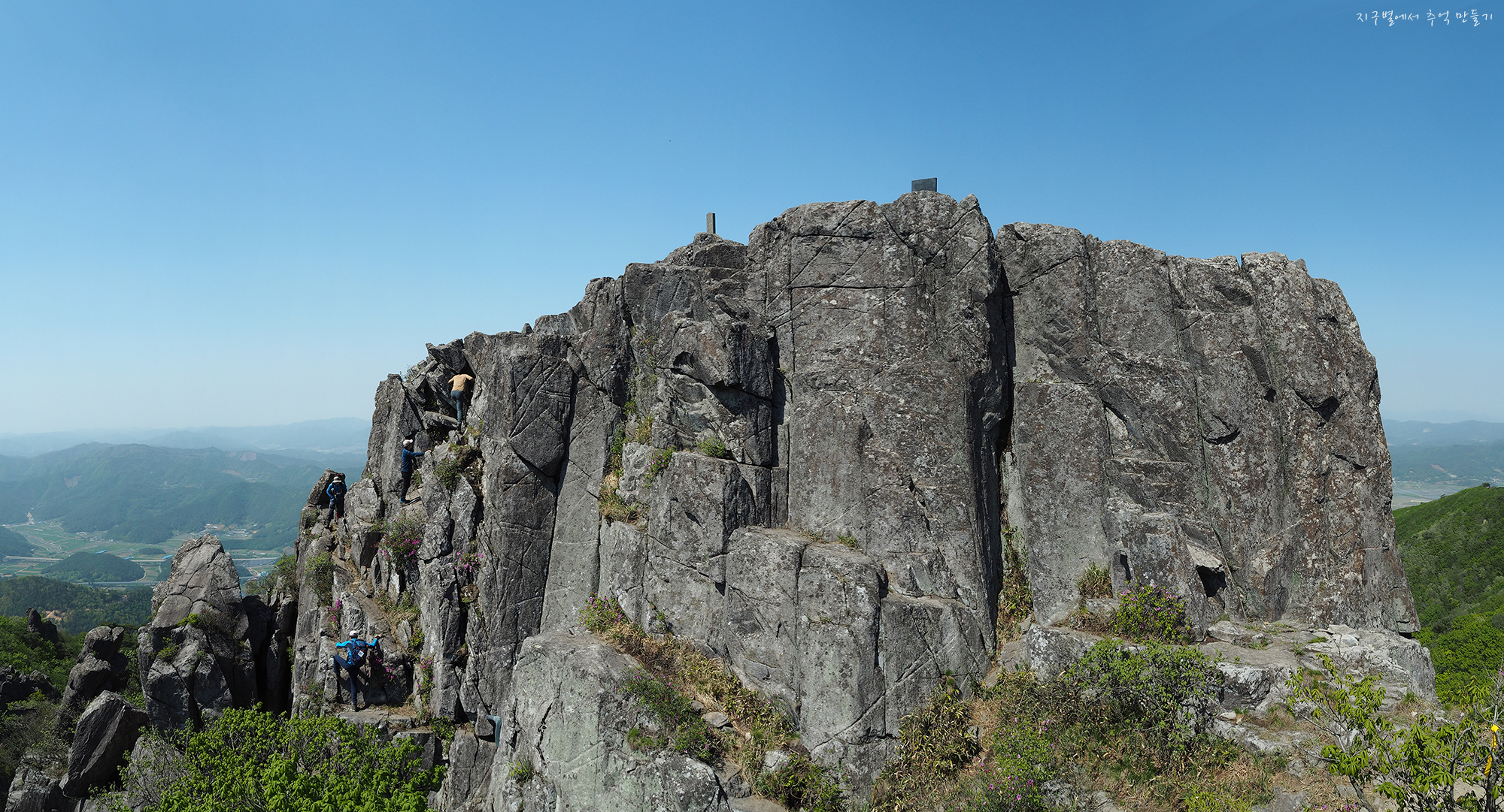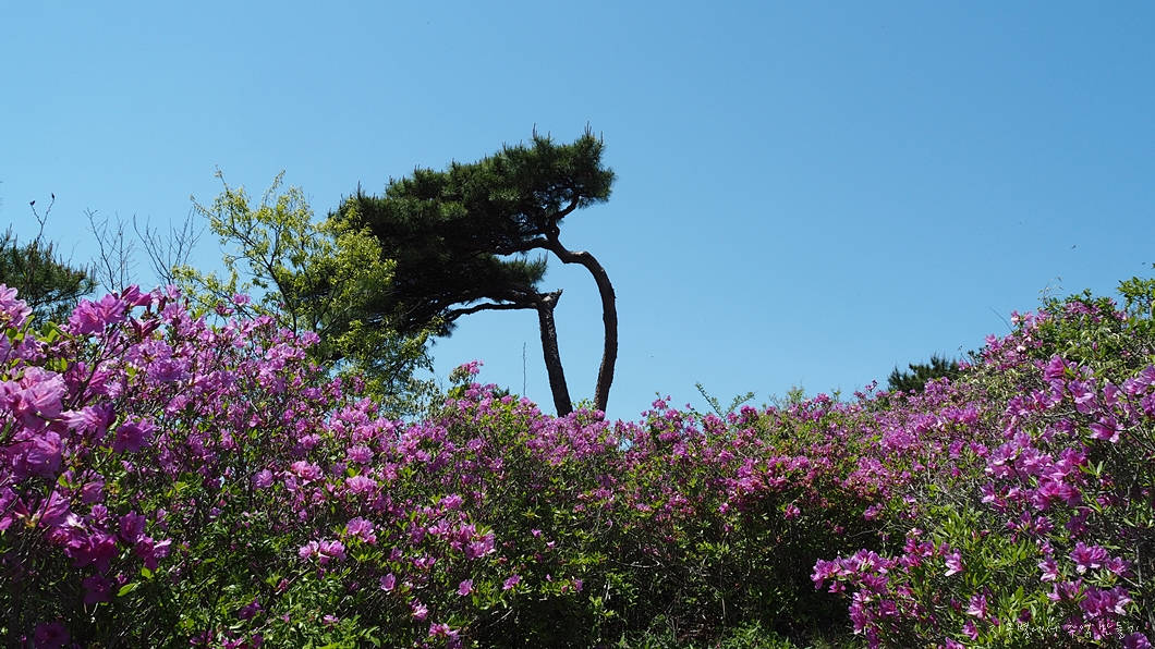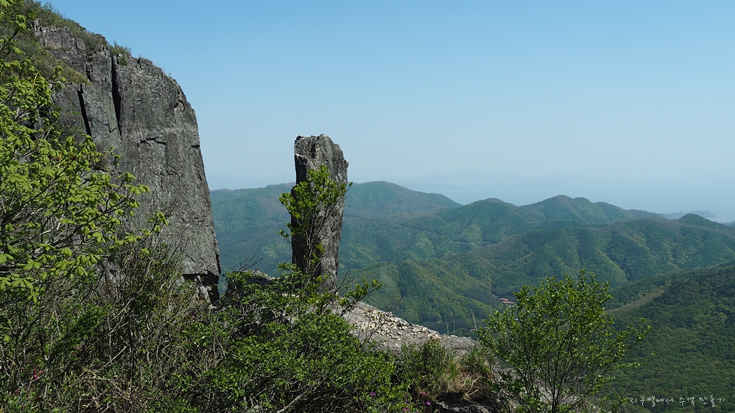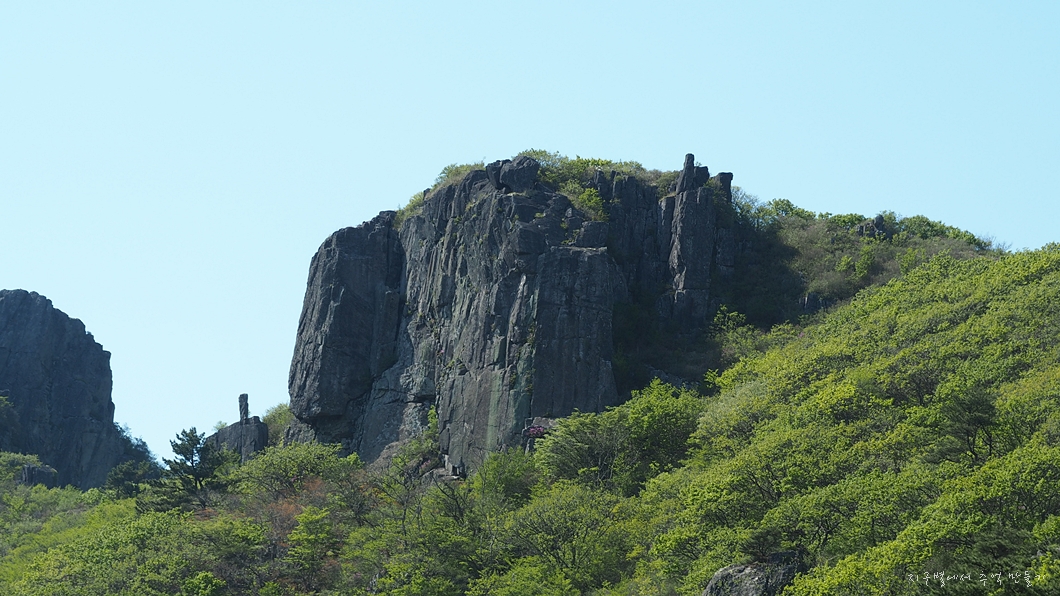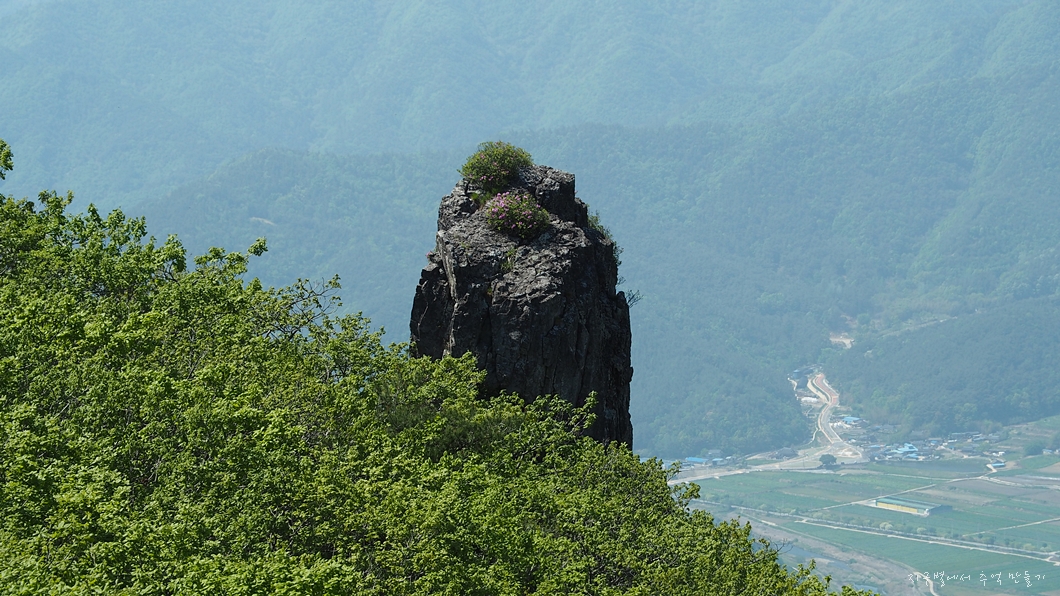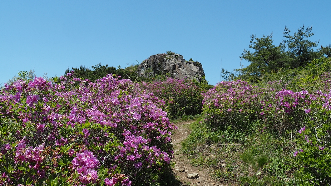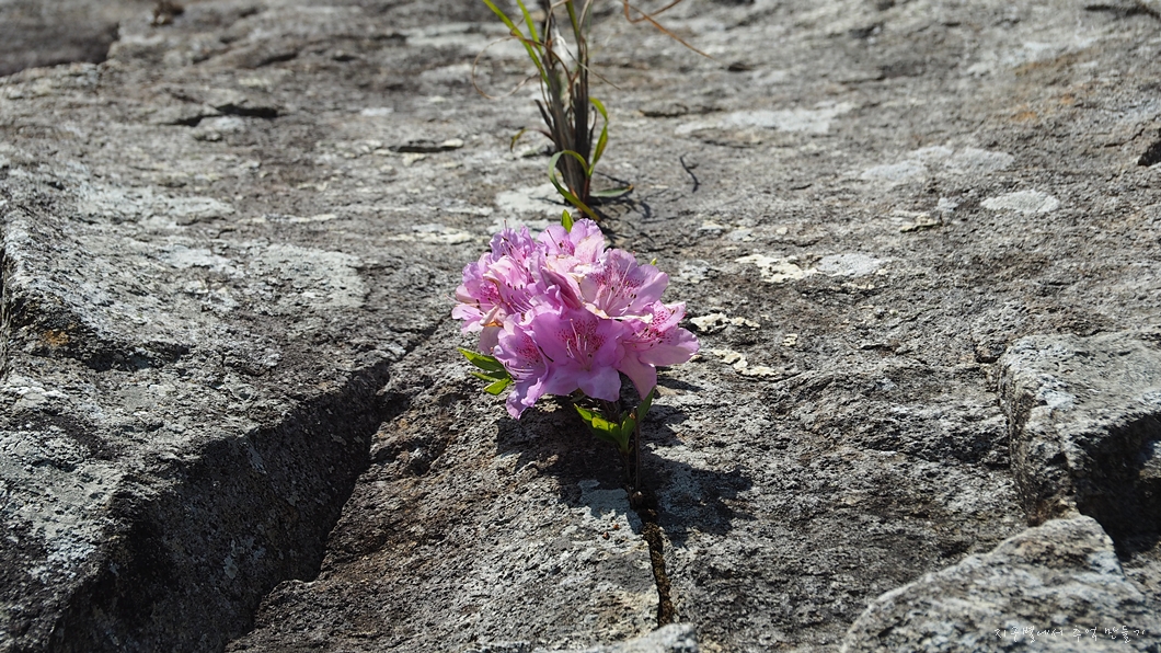 커다란 암봉 중간에 화사하게 피어 있는 철쭉 송이