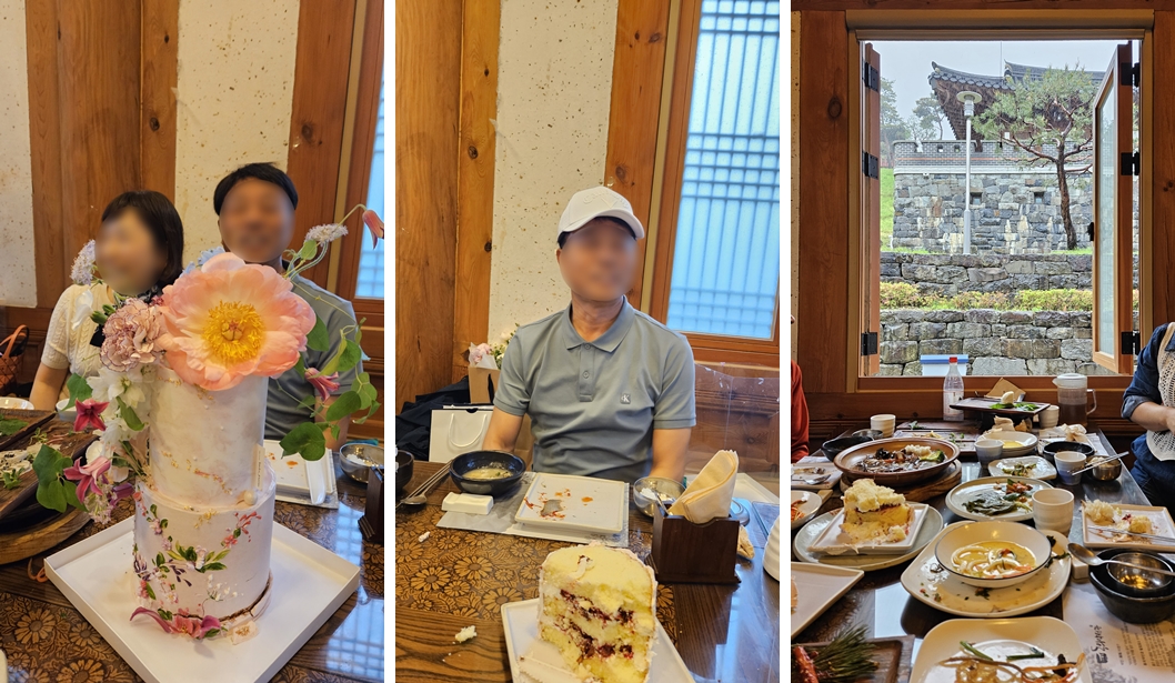 기념 케이크와 동생 내외(左), 제가 사준 골프 모자를 쓰고(中), 창 밖으로 비가 내리는 풍경이 너무 운치 있었답니다.(右)