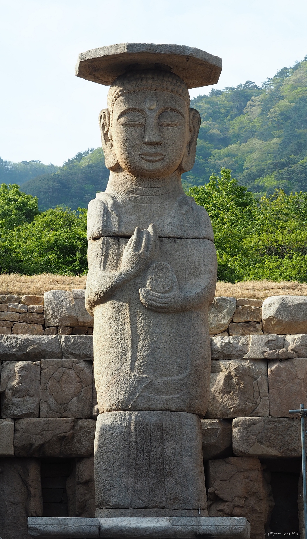 전체 높이가 10.6m로서 모두 5개의 돌조각을 다듬어 쌓아 만들어졌는데 그 위에다 갓바위 부처같이 판석을 얹어 모자를 만들었네요.