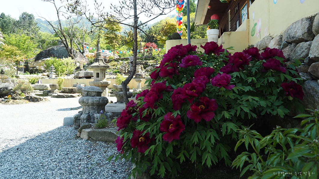 가건물 비슷하게 지어진 대웅전 앞에 목단이 화려하게 피었네요.