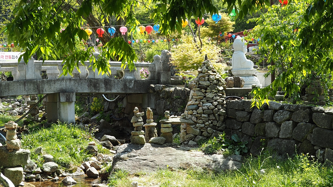 경계를 이루는 도랑 안에도 바깥에도 돌탑들을 정성스럽게 쌓아 두었네요.