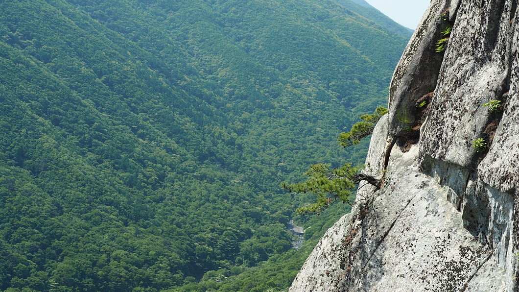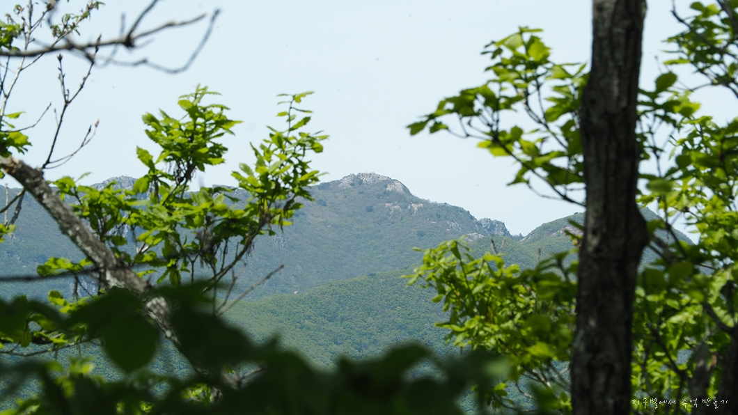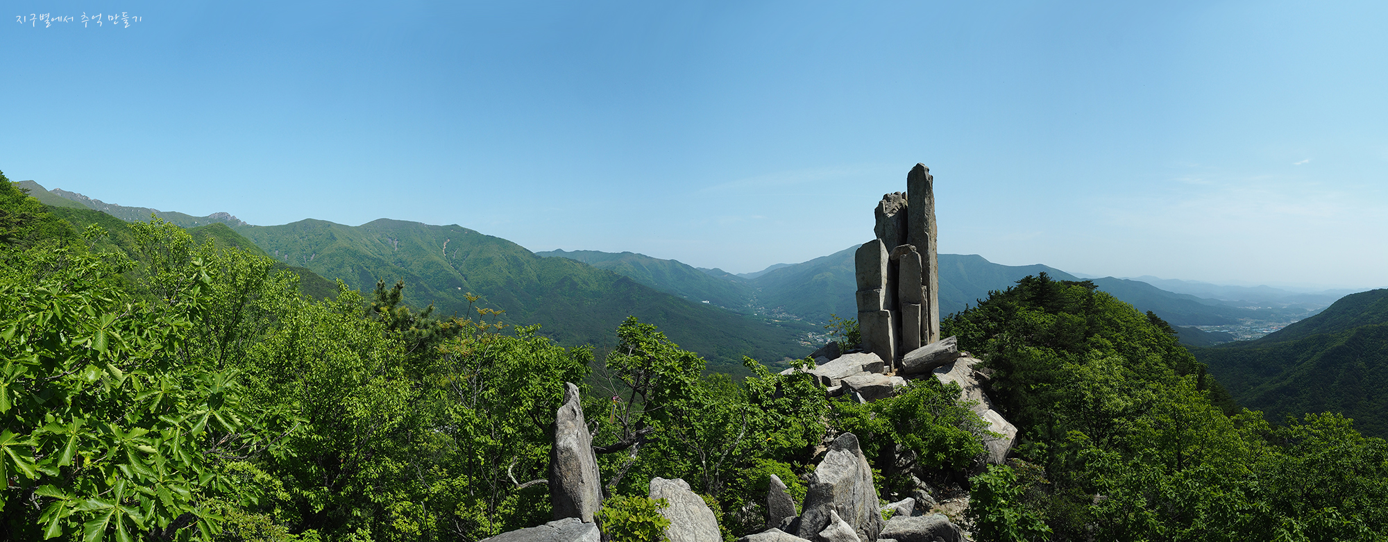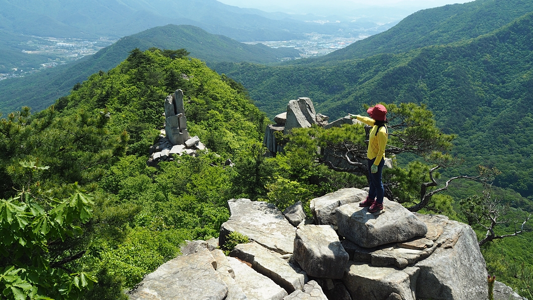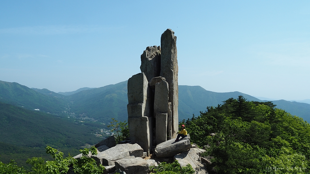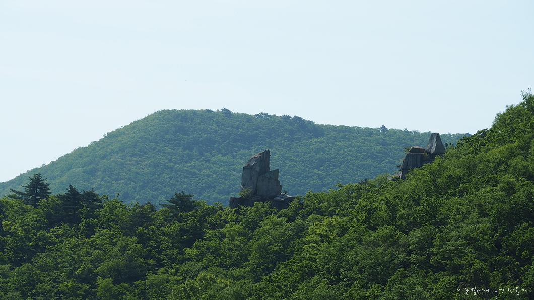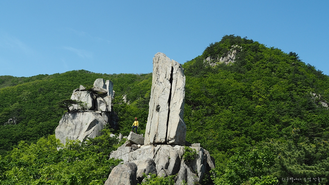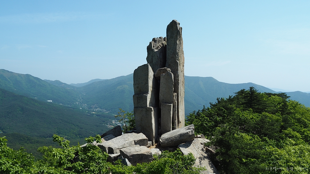 뒤편으로 가지산 상운산 고헌산이 병풍처럼 펼쳐지고 우뚝 솟은 입석대는 초록맞이 5월의 기운을 하늘로 솟아 올립니다.