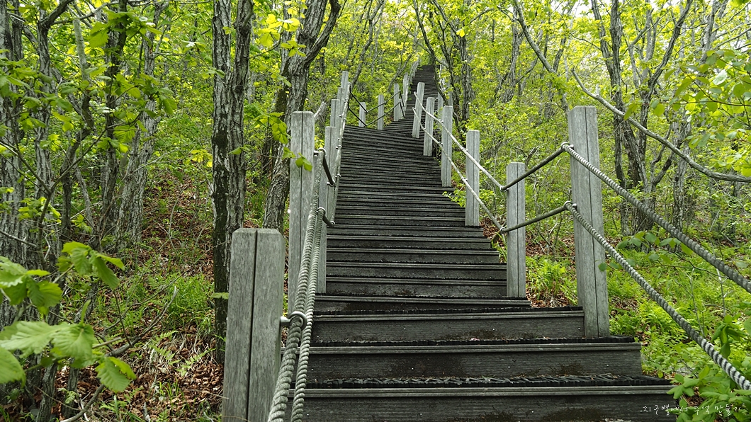 무던한 등산로를 걷다가 길게 이어지는 데크 계단길을 올라갑니다.