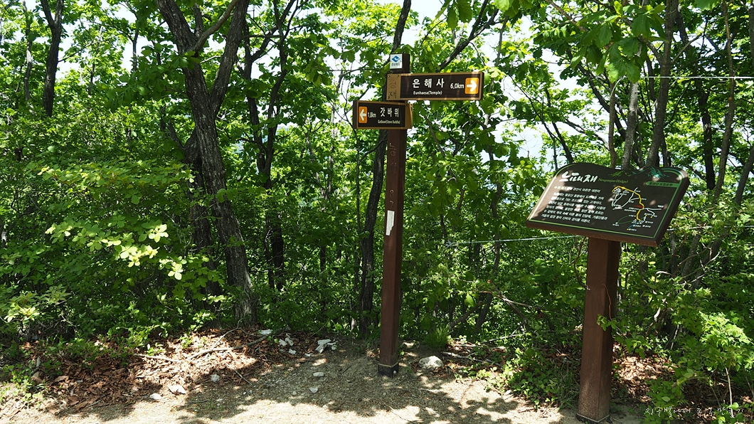 그 뒤 오른편에 솟은 봉우리가 은해봉이고 그 옆이 능성재로 오늘 산행 갈림길입니다.