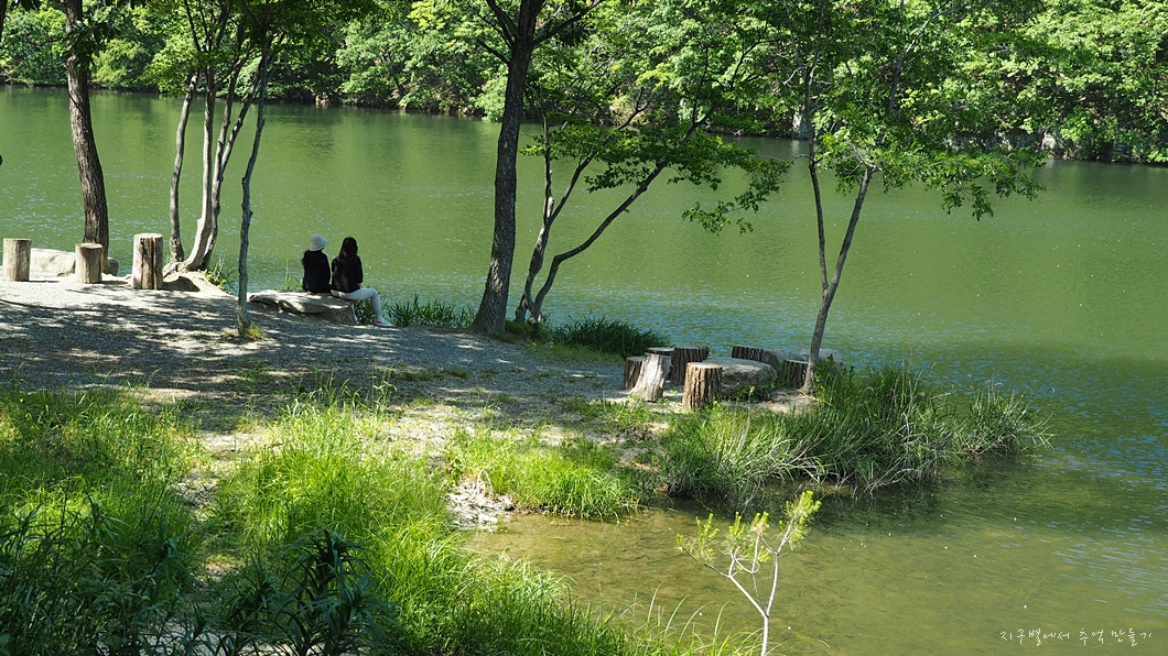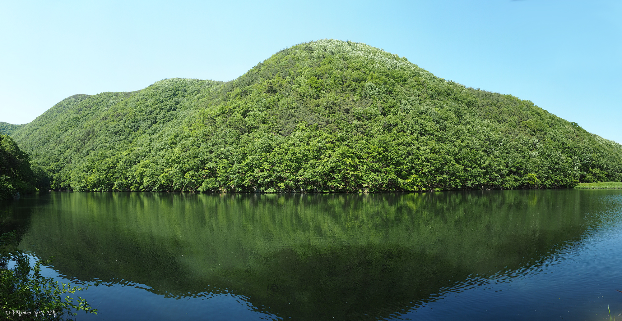 호수에 비친 앞쪽 산자락이 초록으로 지금은 빛나는데...