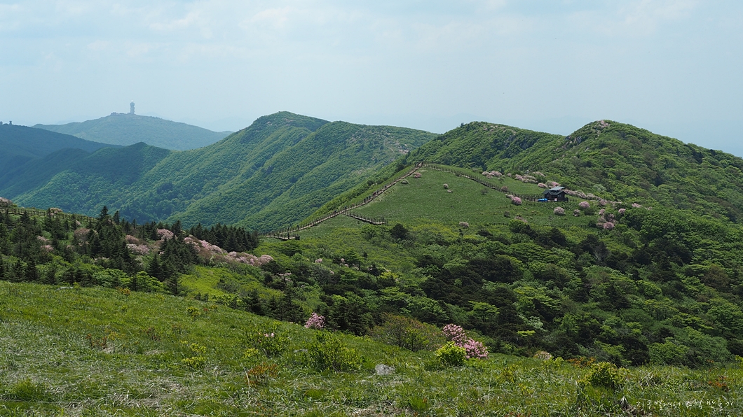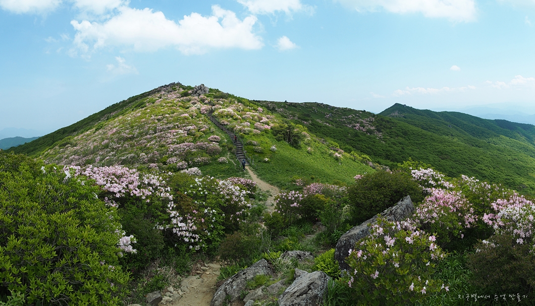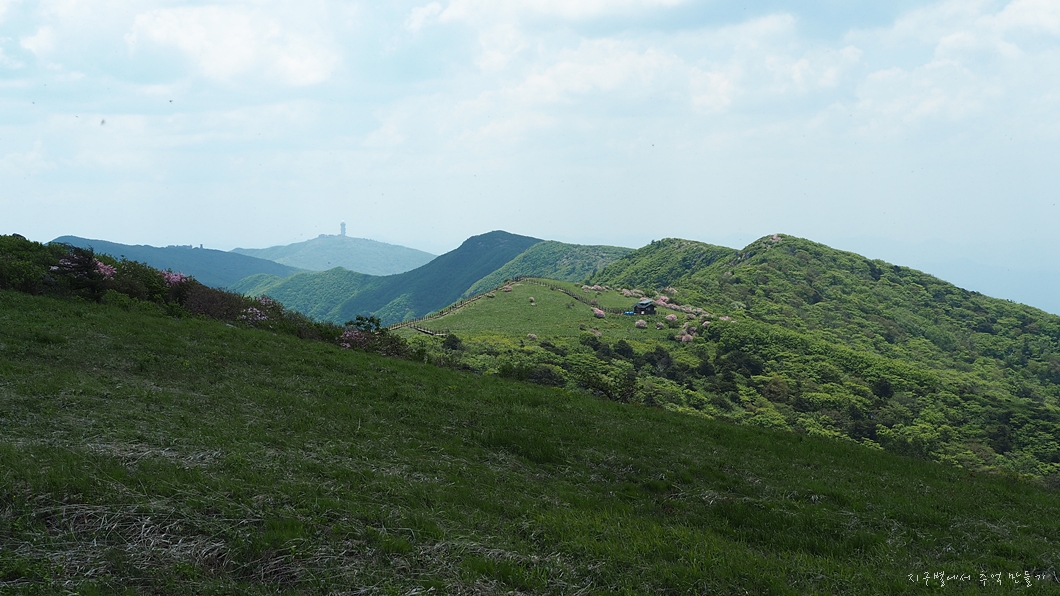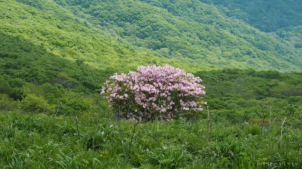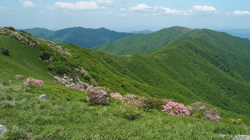 능선 중간에 있는 철쭉 꽃밭.